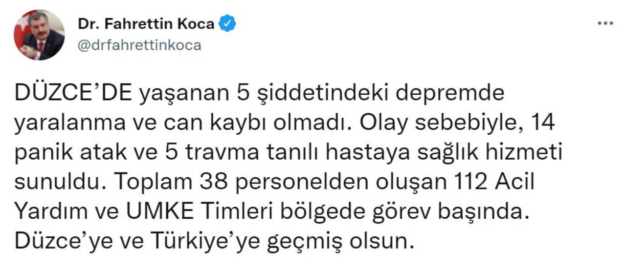 "Düzce'de yaşanan 5 şiddetindeki depremde yaralanma ve can kaybı olmadı. Olay sebebiyle, 14 panik atak ve 5 travma tanılı hastaya sağlık hizmeti sunuldu. Toplam 38 personelden oluşan 112 Acil Yardım ve UMKE Timleri bölgede görev başında. Düzce’ye ve Türkiye’ye geçmiş olsun."