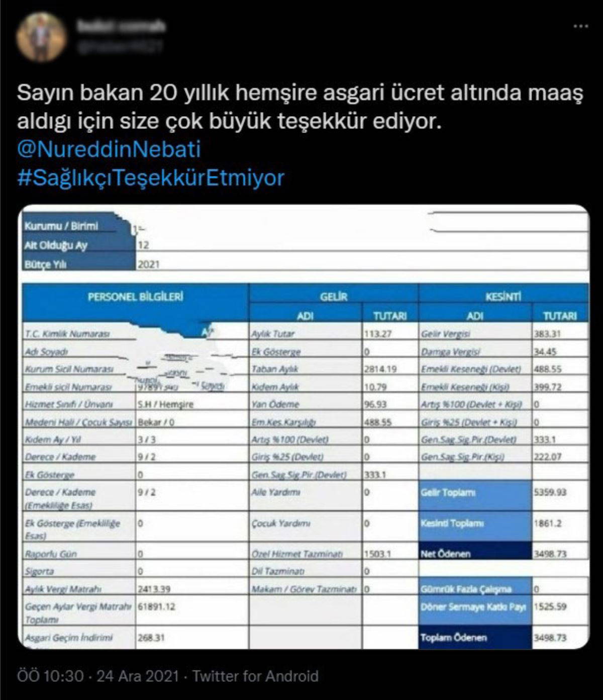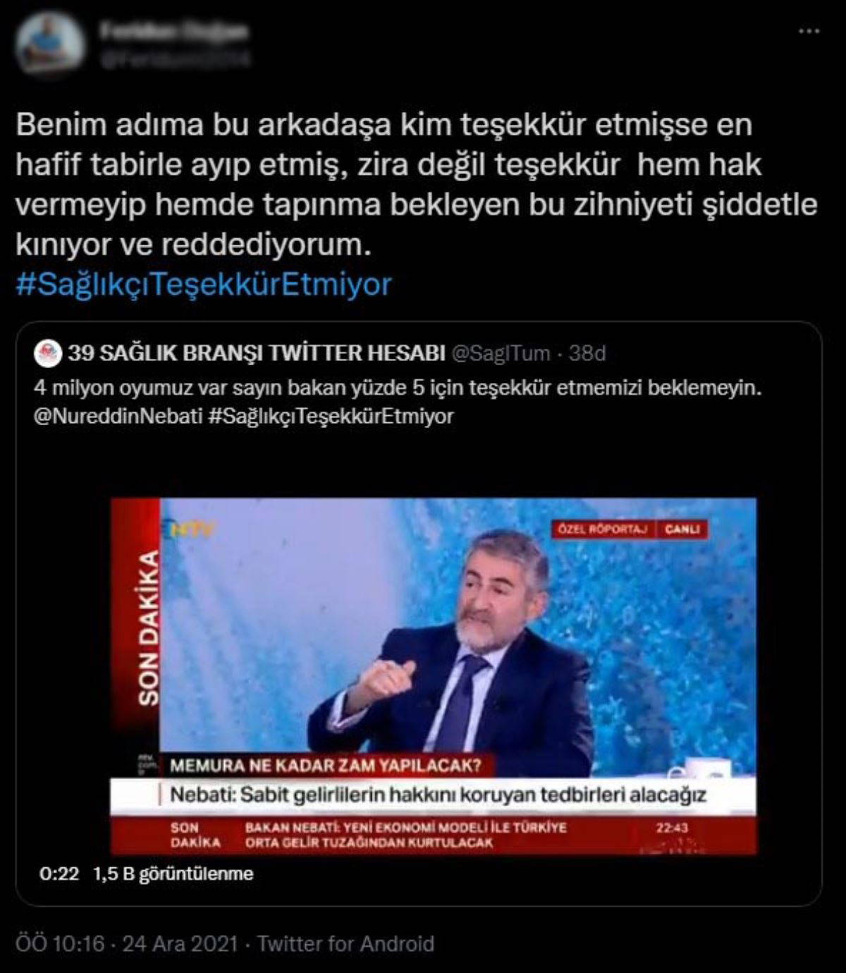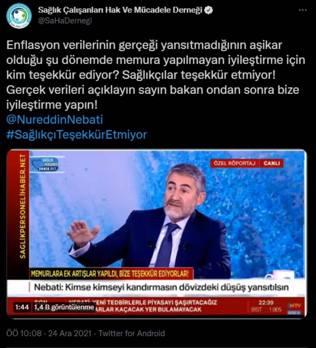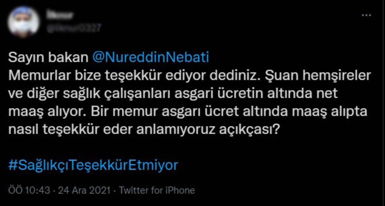 Nebati'nin memura ve emekliye ek zam açıklamaları ise sosyal medyada tepkiye neden oldu. Twitter üzerinden #SağlıkçıTeşekkürEtmiyor diyen sağlıkçılar asgari ücretin altında kalan maaşlara dikkat çekerek yüzde 5 için teşekkür etmeyeceklerini ifade ettiler.