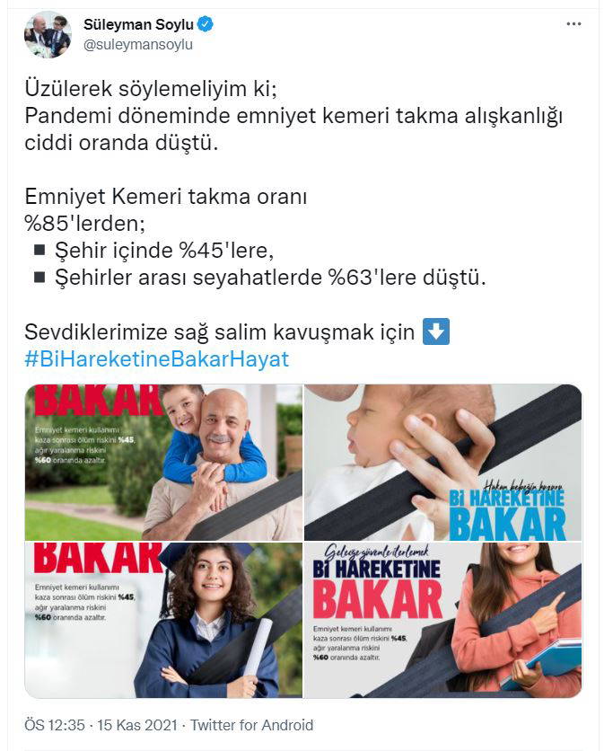 Bakan Soylu, Twitter hesabından yaptığı açıklamada, "Üzülerek söylemeliyim ki; pandemi döneminde emniyet kemeri takma alışkanlığı ciddi oranda düştü. Emniyet kemeri takma oranı yüzden 85'lerden; şehir içinde yüzde 45'lere, şehirler arası seyahatlerde yüzde 63'lere düştü. Sevdiklerimize sağ salim kavuşmak için bir hareketine bakar hayat" ifadelerini kullandı.