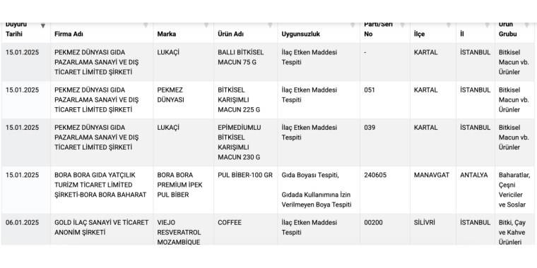 Bakanlığın internet sitesinde zaman dilimi ve ürün grubu seçimi yapılabilen listede, “bitkisel macun” ve kahve gibi ürünlerde ilaç etken maddeleri tespit edildi.