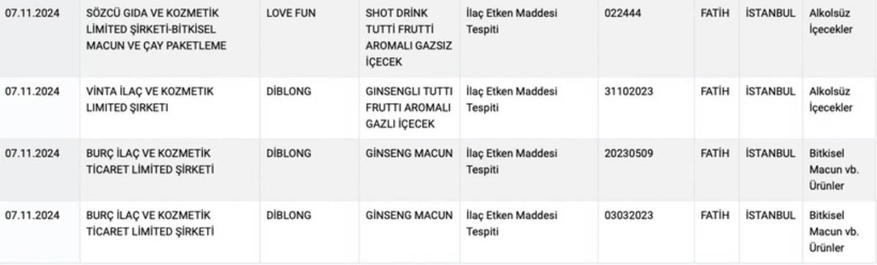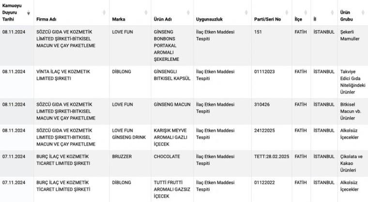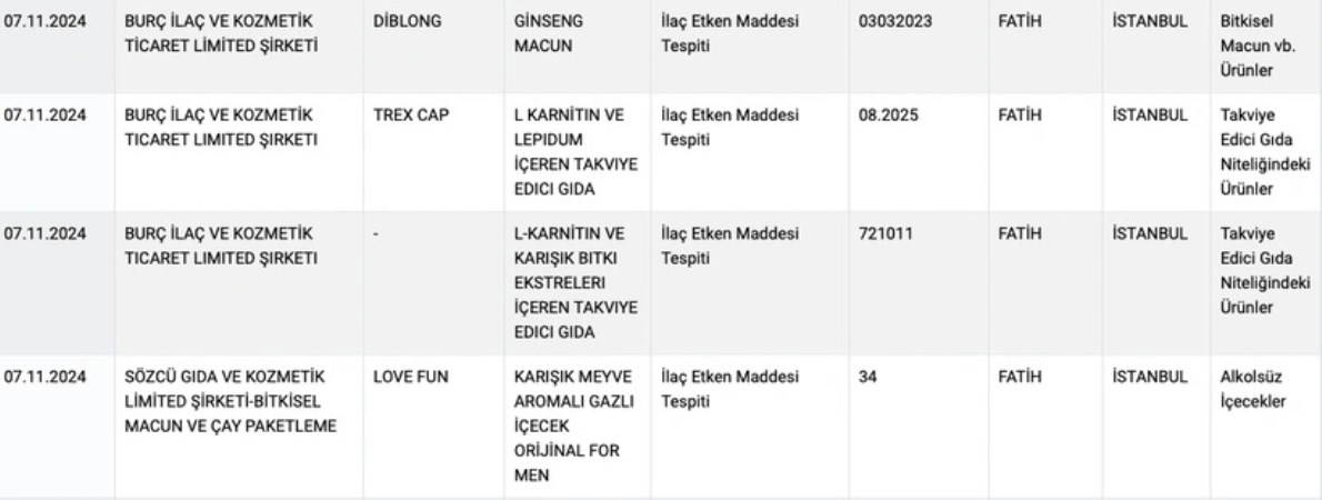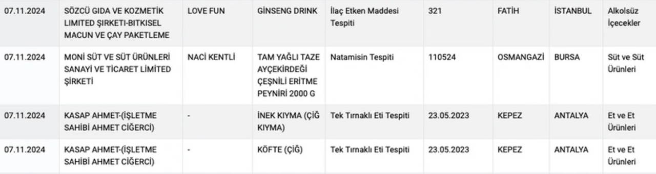 Buna göre, köfte ve kıymada tek tırnaklı eti; eritme peynirinde natamisin; ginseng içeceği, gazlı içecek ve takviye edici gıdada, ginseng macunda, çikolata ve şekerlemede ilaç etken maddesi tespit edildi.