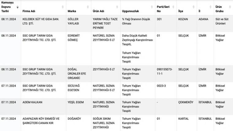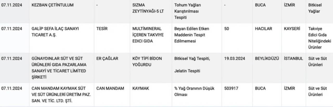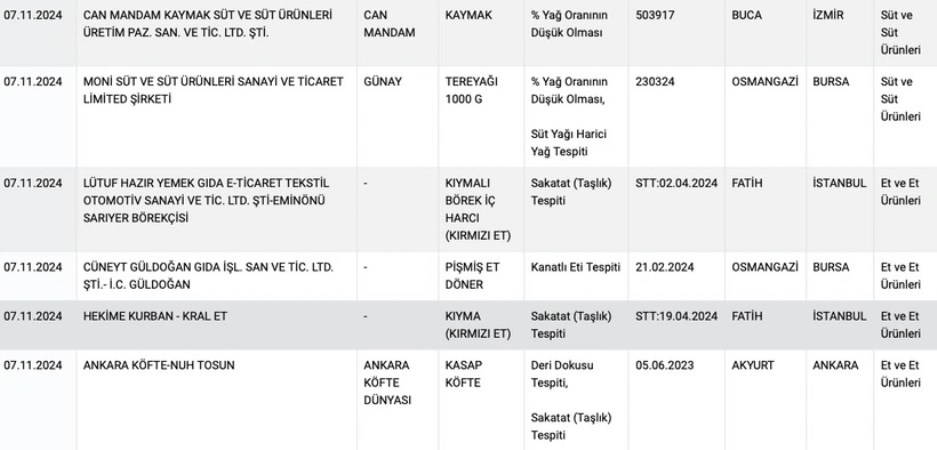 'Taklit veya Tağşiş Yapılan Gıdalar' listesine eklenen gıdalar arasında ise köfte, kıyma, et döner, kıymalı börek iç harcı, tereyağı, kaymak, yoğurt, takviye edici gıda, zeytinyağı ve eritme tost peyniri yer aldı. Buna göre, köfteden deri dokusu ve taşlık; kıymadan taşlık; et dönerden kanatlı eti; kıymalı börek iç harcından taşlık; yoğurttan bitkisel yağ ve jelatin; zeytinyağıdan tohum yağı çıktı.