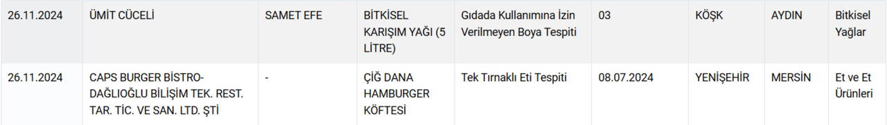 Ayrıca, "Samet Efe" markalı bitkisel karışım yağında da gıdalarda kullanılmasına izin verilmeyen zararlı bir boya tespit edildi.