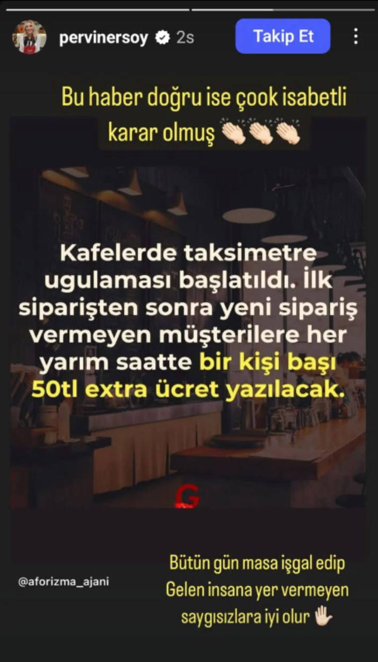 Bir sosyal medya hesabının "Kafelerde taksimetre uygulaması başlatıldı. İlk siparişten sonra yeni sipariş vermeyen müşterilere her yarım saatte bir kişi başı 50 TL ekstra ücret yazılacak" şeklindeki paylaşımını alıntılayan Pervin Ersoy, o paylaşıma şu notu düştü: