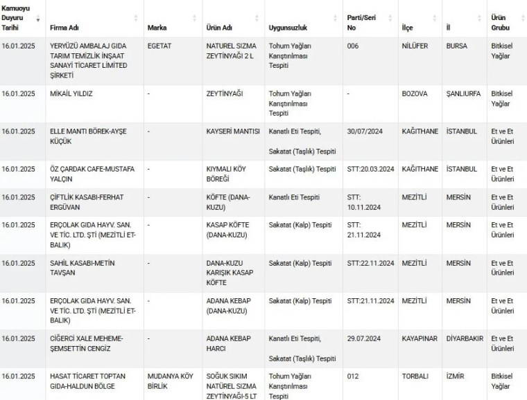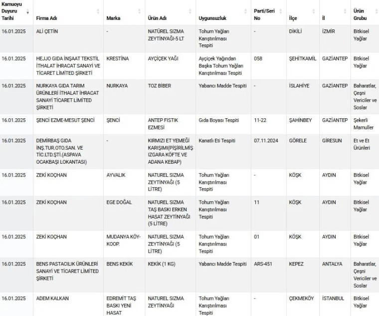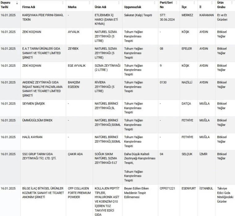 Tarım ve Orman Bakanlığı, taklit ve tağşişi listesini yayımlamaya devam ediyor. Yeni yayımlanan duyuruda zeytinyağında ve kırmızı ette taklit ve tağşiş karıştığı görüldü.