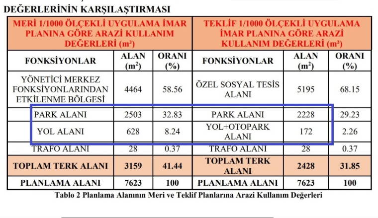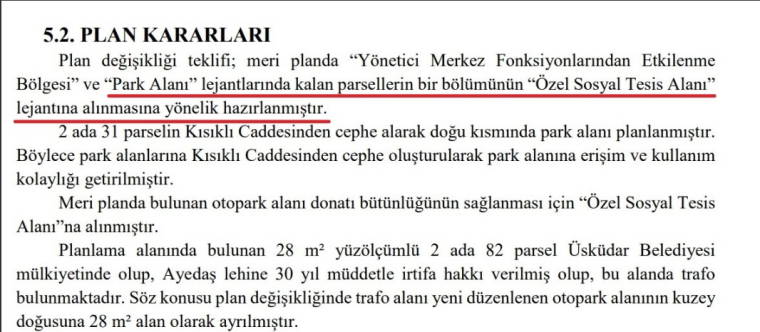 Plan değişikliği raporunun “Plan Kararları” başlığı altında özetle şöyle denildi: “Plan değişikliği teklifi; meri planda ‘Yönetici Merkez Fonksiyonlarından Etkilenme Bölgesi’ ve “Park Alanı” lejantlarında kalan parsellerin bir bölümünün “Özel Sosyal Tesis Alanı” lejantına alınmasına yönelik hazırlanmıştır. Plan değişikliği ile “Özel Sosyal Tesis Alanı” gerek donatı olarak gerekse ulaşım ve nüfus sirkülasyonu olarak daha az bir yoğunluk getirecektir. Özel Sosyal Tesis Alanında yapılaşma koşulları T.A.K.S.: 0,50, K.A.K.S.: 1,00, Yençok: Z+3 kat olarak belirlenmiştir.