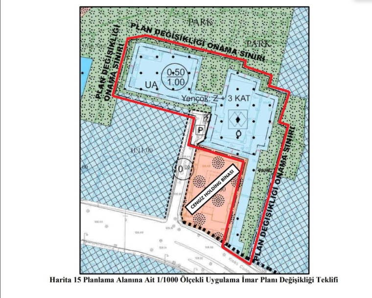 Cengiz İnşaat, kendi mülkiyetinde bulunan ancak yürürlükteki imar planlarına göre bir kısmı yeşil alan ve yolda kalan arazileriyle ilgili plan değişikliği istedi. 2014-2019 döneminde AKP’den Çekmeköy Belediye Meclis üyeliği de yapan Şehir Plancısı Nagihan Ürgen’e hazırlatılan plan değişikliği, Altunizade 2 ada 31,63 ve 64 nolu parselleri kapsıyor.