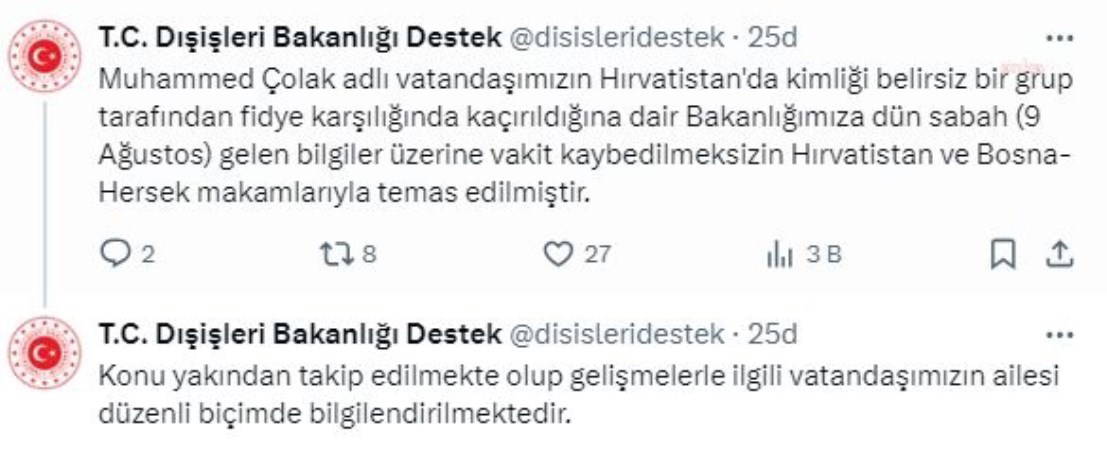 "Muhammed Çolak adlı vatandaşımızın Hırvatistan'da kimliği belirsiz bir grup tarafından fidye karşılığında kaçırıldığına dair Bakanlığımıza dün sabah (9 Ağustos) gelen bilgiler üzerine vakit kaybedilmeksizin Hırvatistan ve Bosna-Hersek makamlarıyla temas edilmiştir. Konu yakından takip edilmekte olup gelişmelerle ilgili vatandaşımızın ailesi düzenli biçimde bilgilendirilmektedir."