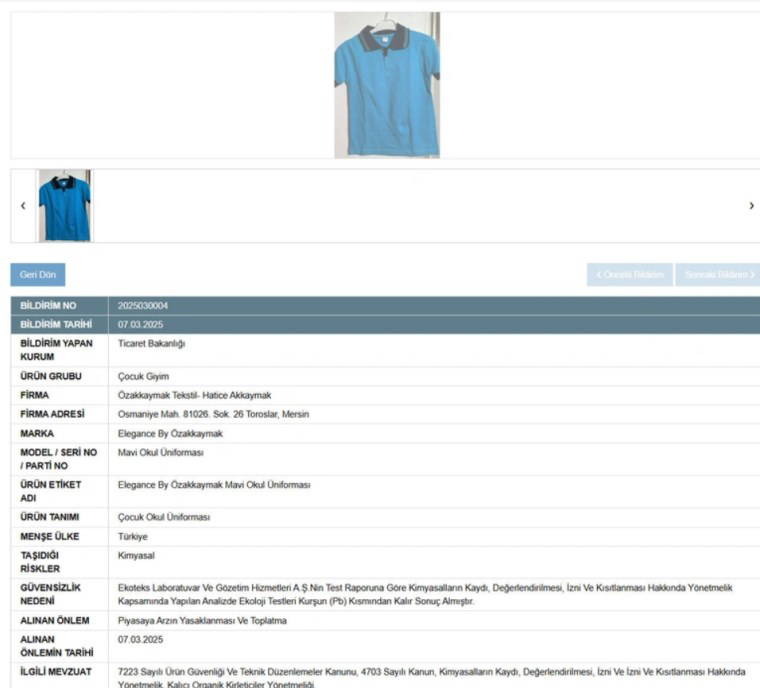Ticaret Bakanlığı'nın 7 Mart tarihli duyurusunda, mavi okul üniformasının zararlı kimyasallar içerdiği aktarıldı.