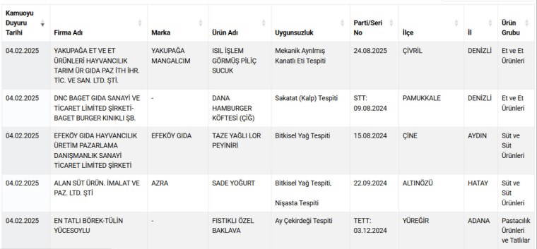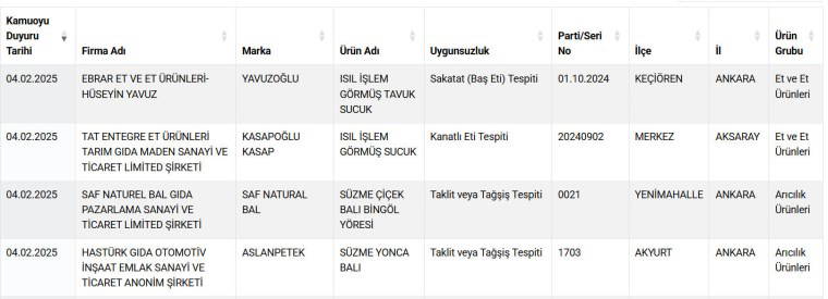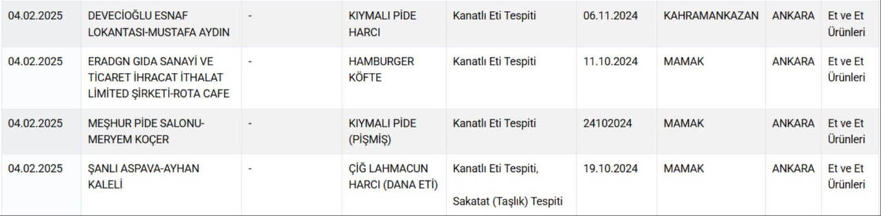 Bakanlığın açıkladığı listeye göre sucukta kanatlı eti ve baş eti, lahmacun, kıymalı pide, çiğ dana etine kanatlı eti karıştırıldığı görüldü. Hamburgerde ise kalp tespit edildi.