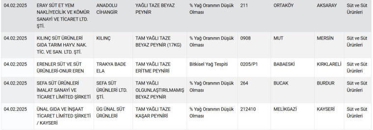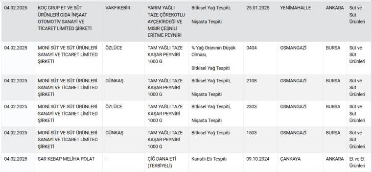Peynir, tereyağı ve yoğurtta yağ oranlarının düşük olduğu ve bitkisel yağ karıştırıldığı duyuruldu. Ayrıca yoğurtta nişasta katıldığı belirlendi.