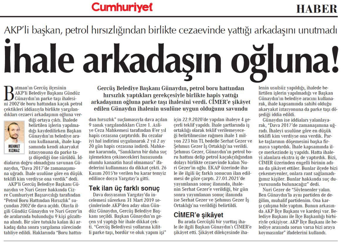 Mehmet Kızmaz'ın “Petrol Hırsızlığından Parke Taşı İhalesine” haberi: