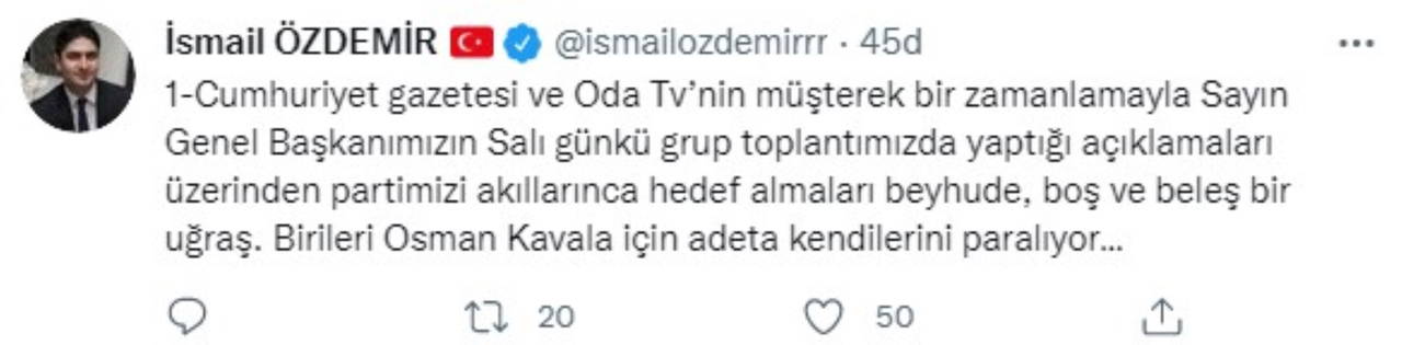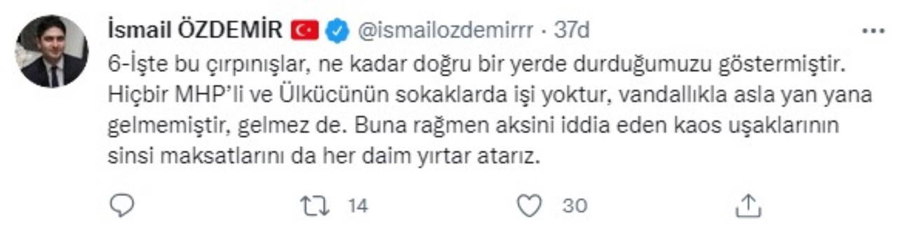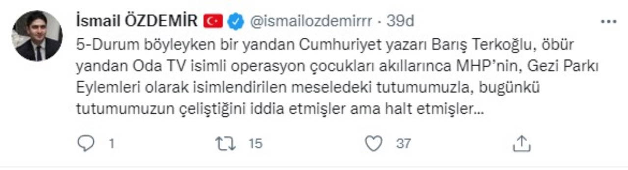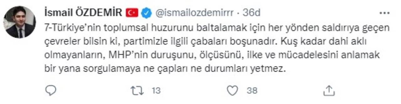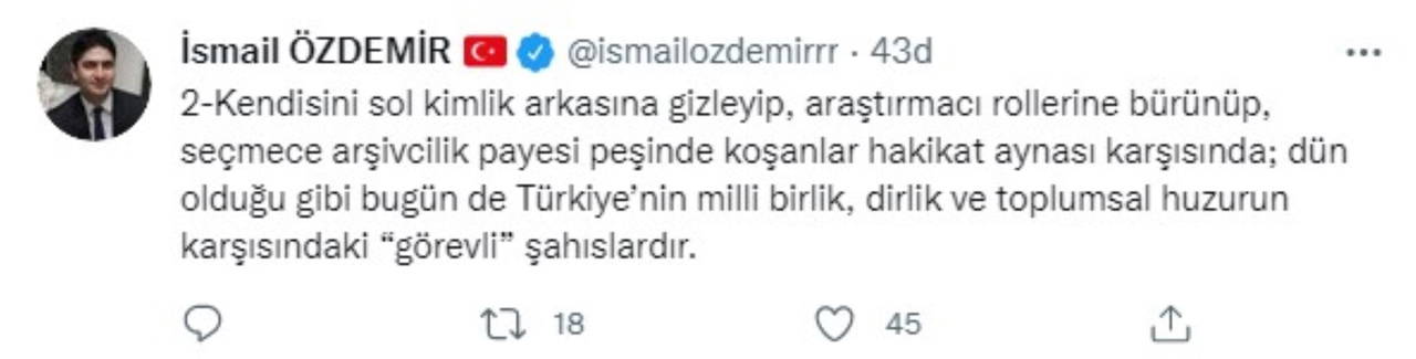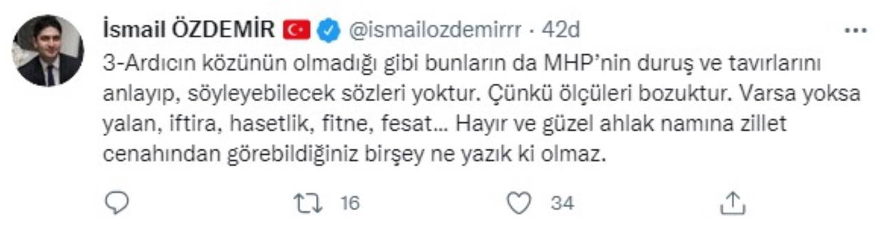 Terkoğlu'nun, Bahçeli'nin yıllar önceki sözlerini gündeme getirmesinin ardından MHP Kayseri Milletvekili ve Medya, Tanıtım ve Halkla İlişkilerden Sorumlu Genel Başkan Yardımcısı İsmail Özdemir gazetemizi ve yazarımızı hedef aldı.