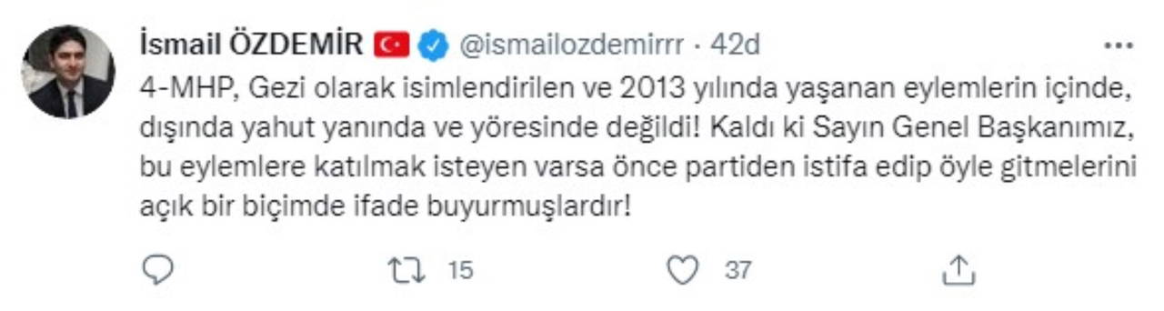 Özdemir'in, bir dönem partisinin Gezi eylemlerine destek veren açıklamalarına rağmen "MHP, Gezi olarak isimlendirilen ve 2013 yılında yaşanan eylemlerin içinde, dışında yahut yanında ve yöresinde değildi!" demesi dikkat çekti.