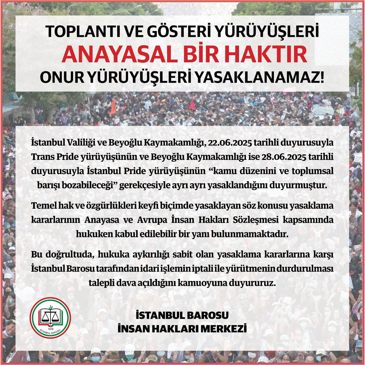İstanbul Barosu İnsan Hakları Merkezi, İstanbul Valiliği ve Beyoğlu Kaymakamlığı tarafından İstanbul Pride ve Trans Pride yürüyüşlerine getirilen yasaklara karşı dava açtığını duyurdu. Baro yaptığı açıklamada, “Toplantı ve gösteri yürüyüşleri anayasal bir haktır, onur yürüyüşleri yasaklanamaz” ifadelerine yer verdi.