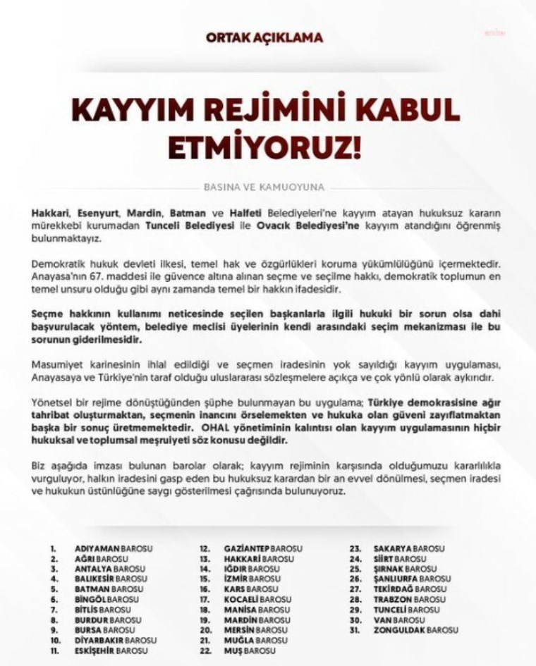 Barolar olarak; kayyım rejiminin karşısında olduğumuzu kararlılıkla vurguluyor, halkın iradesini gasp eden bu hukuksuz karardan bir an evvel dönülmesi, seçmen iradesi ve hukukun üstünlüğüne saygı gösterilmesi çağrısında bulunuyoruz.”