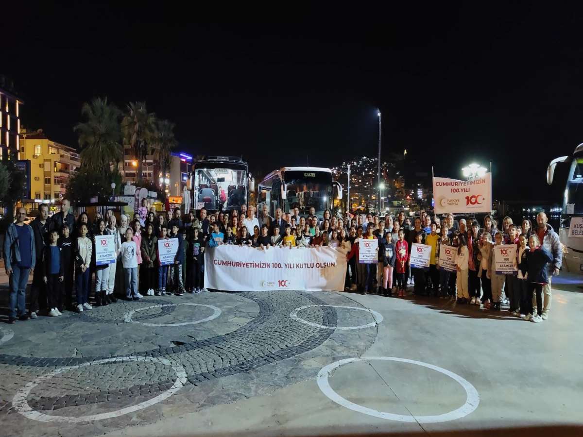 Aydın’da Kuşadası Belediyesi, Cumhuriyet'in kuruluşunun 100'üncü yılında, kentteki 100 ilkokul öğrencisini aileleriyle birlikte Anıtkabir'i ziyaret etmeleri için Ankara'ya götürdü. Ata'nın huzuruna çıkacakları için çok heyecanlı olan çocukları, İsmail Cem Dostluk ve Barış Meydanı'ndan otobüslerle Ankara'ya Belediye Başkan Vekili Gürol Turhan ve İlçe Milli Eğitim Müdürü İbrahim Ataman uğurladı. Keyifli bir yolculuğun ardından Ankara'ya ulaşan Kuşadalı çocuklar, güne Çukurambar'da yapılan kahvaltı ile başladı. Öğrenciler, daha sonra Ulus'ta bulunan 1'inci TBMM (Kurtuluş Savaşı Müzesi) ve 2'inci TBMM (Cumhuriyet Müzesi) binalarını gezdi. Müze görevlilerinden sergilenen eserler hakkında bilgi alan çocuklar, anne ve babalarıyla da bol bol hatıra fotoğrafı çektirdi. Çocuklar ve veliler ardından Anıtkabir'e gelerek Aslanlı Yol girişinde Kuşadası Belediye Başkanı Ömer Günel ile buluştu. Burada Kuşadalı çocuklara ve ailelerine Türk Bayrakları dağıtıldı. Başkan Ömer Günel Anıtkabir'e çocuklarla birlikte Aslanlı Yoldan yürüyerek girdi.