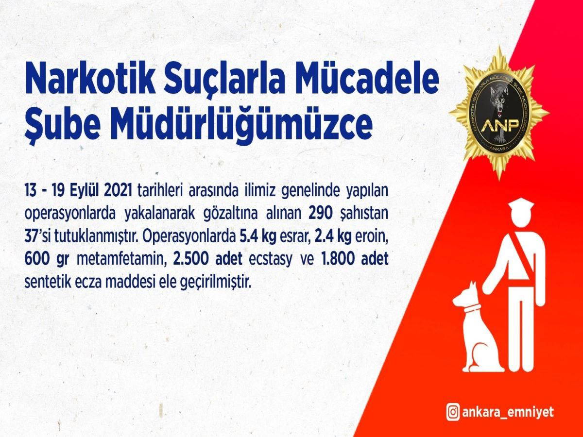 Ankara Emniyet Müdürlüğü Narkotik Suçlarla Mücadele Müdürlüğü ekiplerince Ankara genelinde yapılan operasyonlarda yakalanan 290 kişiden 37’si tutuklandı. Edinilen bilgiye göre, operasyonlarda 5.4 kilogram esrar, 2.4 kilogram eroin, 600 gr metamfetamin, 2 bin 500 adet ekstasy ve bin 800 adet sentetik ecza maddesi ele geçirildiği bildirildi.