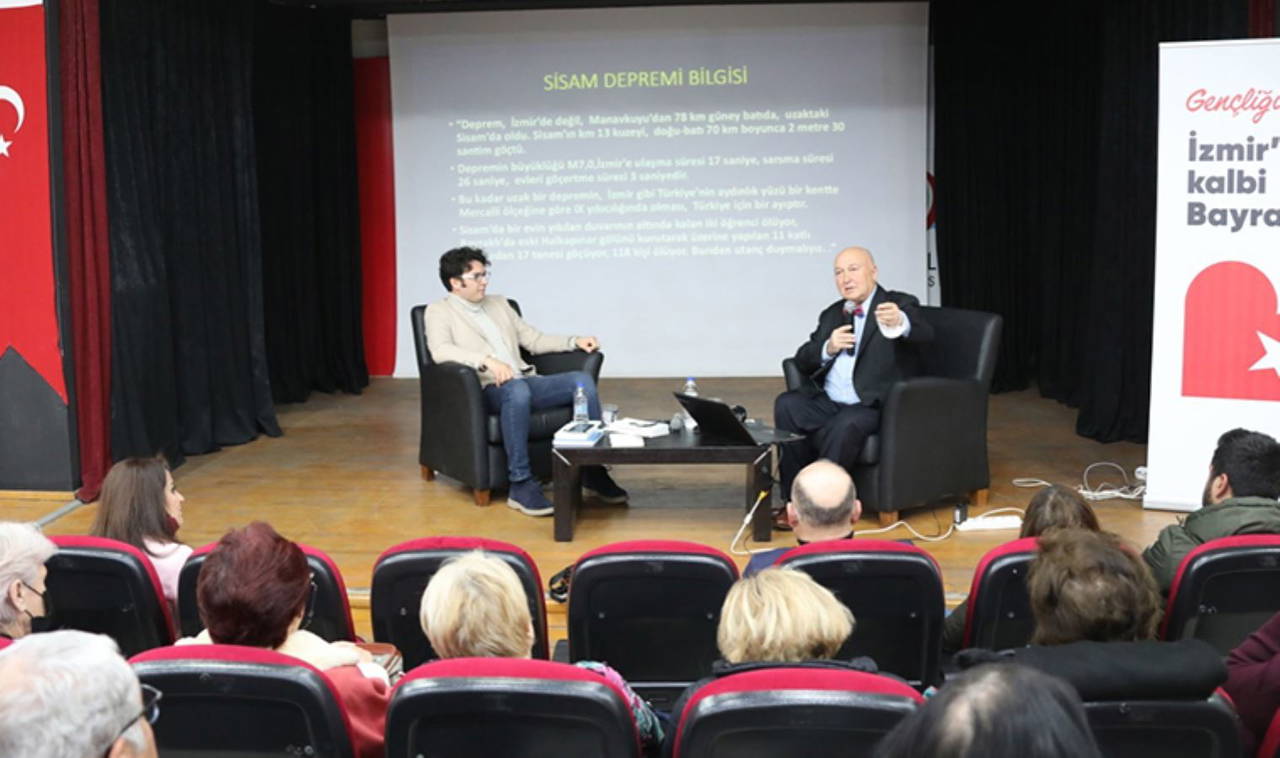 Bayraklı’daki deprem gerçeğini anlatan ve gerçek hikayelerin yer aldığı ‘Bayraklar Asılı Kaldı’ ve ‘Göçük Altında’ adlı kitaplarını anlatarak konuşmasına başlayan Prof. Dr. Övgün Ahmet Ercan, “Deprem konusunda araştırmalar yaparak görüşebildiğim kadar vatandaşla konuştum ve etkilerini bir kitapta topladım. İnsanlar depremde korku ve can havliyle hemen kaçmaya, çocuklarına koşmaya, telefonlarına ulaşmaya çalışıyor ve birçoğunu da deprem ayakta, merdivende, kapıda yakalıyor. Hayatta kalmak için en güvenli yerde cenin pozisyonunda, kafamızı koruyacak şekilde kalmak, alabiliyorsak belki telefonu yanımıza almak en doğru sonuç olacaktır. Yaşadığımız yapıların sağlam zeminde, kaliteli yapılmış olmasına dikkat etmek gerekir. Deprem sonrası zemin ve yıkılmayan yapılar yorgunlaştı. Yeni bir depremde yerin sıvılaşması daha da artacak. Dünya afet yasası, büyük deprem sonrası yıkılan evlerin yerine yapılaşma olamayacağını söylüyor. Ama bizim ülkemizde bu durum farklı işliyor. Halkımız da yıkılan evinin yerine yeni ev yapılsın istiyor. Ama biri de çıkıp buraya yeni yapı yapılması doğru değildir” demiyor. Daha güvenli zeminlerin olduğu yerlerde yapılaşmaların olması en doğru karar olmalıdır. Deprem gerçeğini hiçbir zaman unutmayalım” diye konuştu.