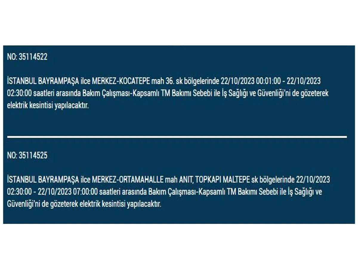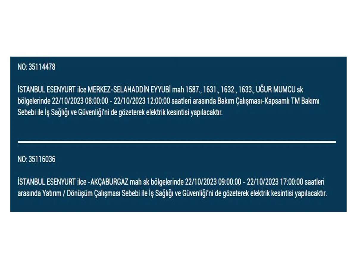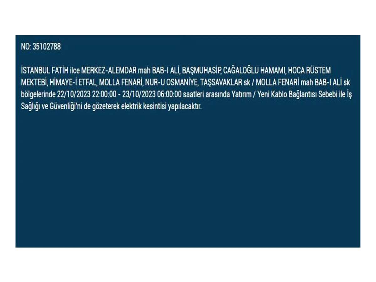 BEDAŞ'ın açıkladığı ilçe ve sokaklar şöyle: