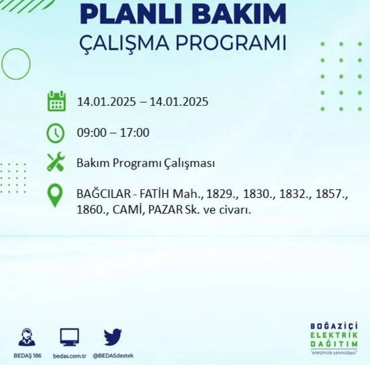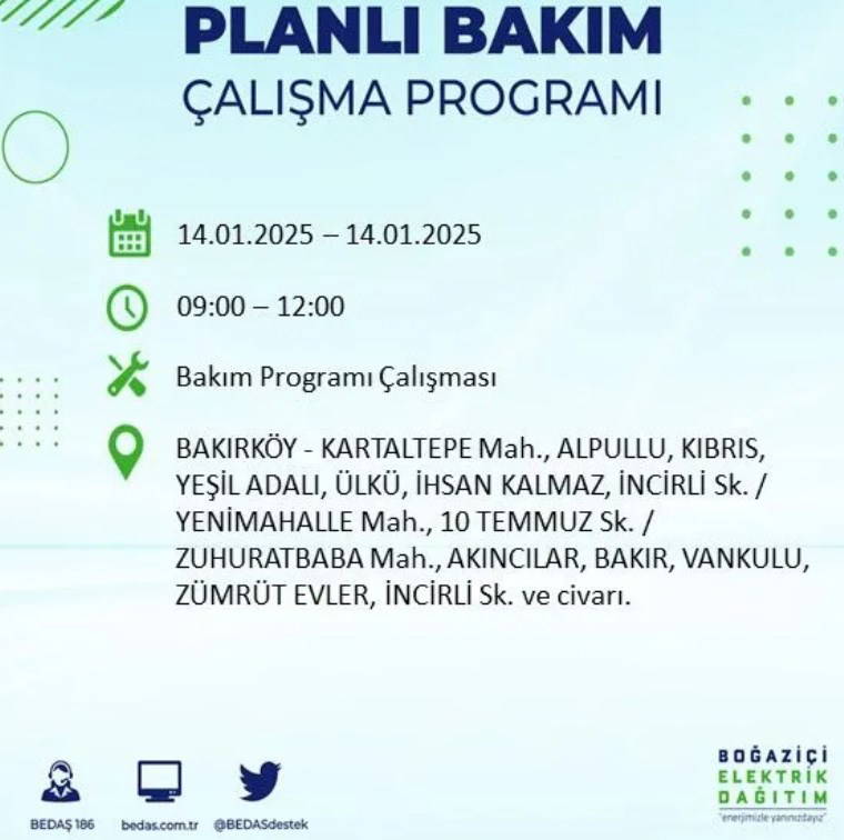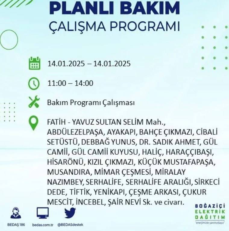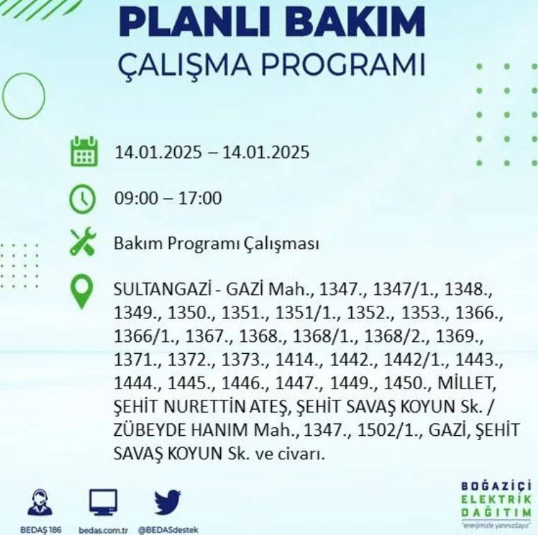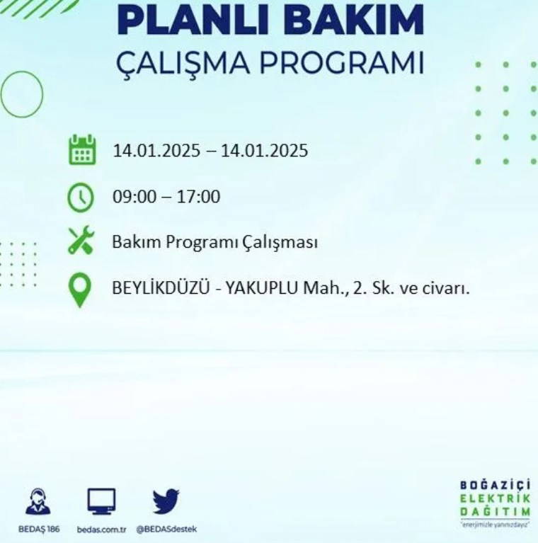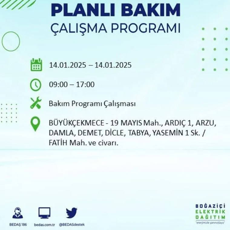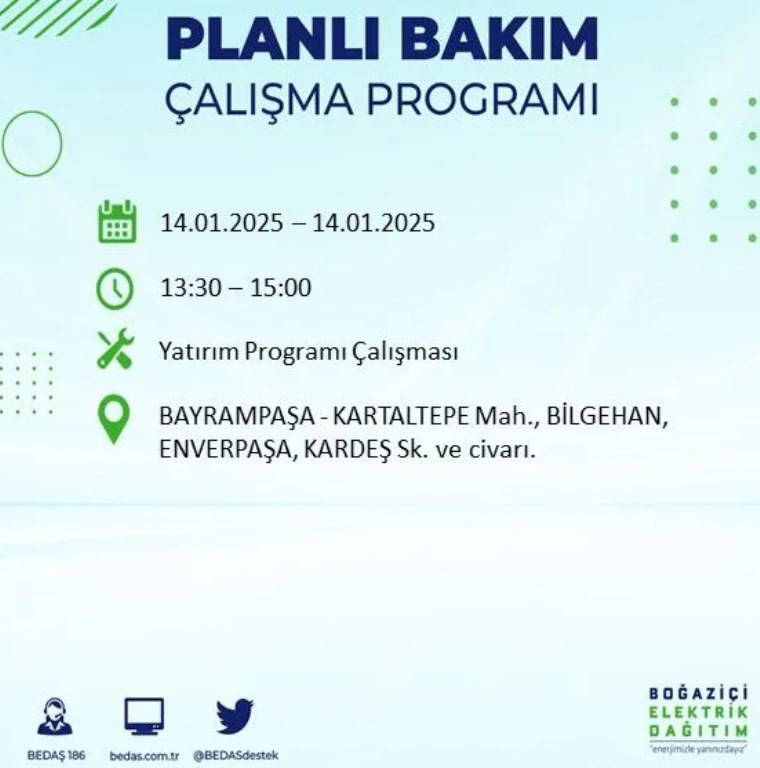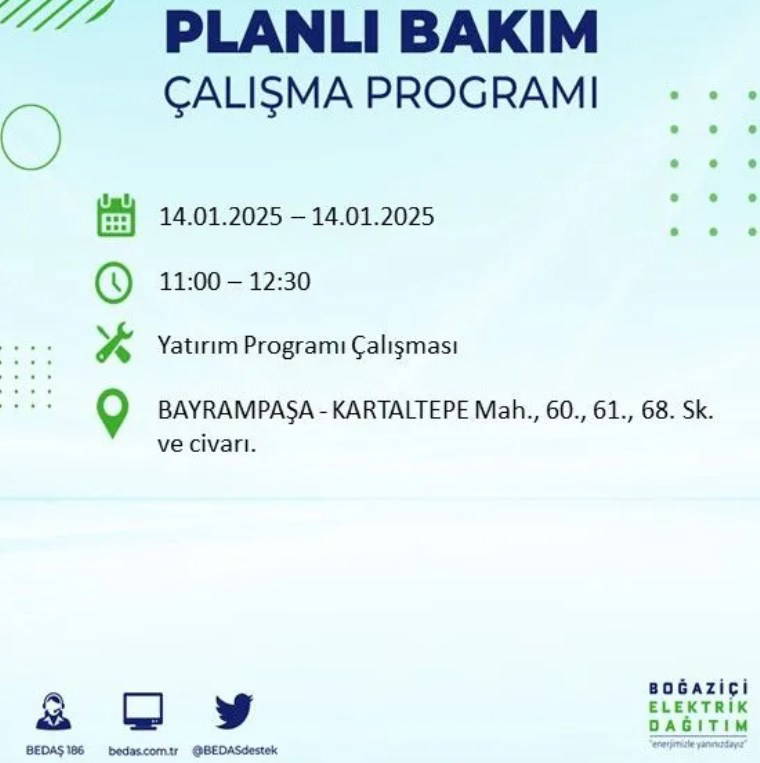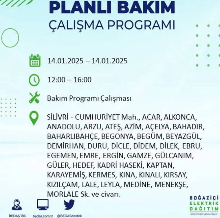 Boğaziçi Elektrik Dağıtım A.Ş. (BEDAŞ), İstanbul'da planlı bakım çalışmaları kapsamında 14 Ocak Salı günü (bugün) elektrik kesintilerinin yapılacağı ilçe, mahalle ve sokakları internet sitesi üzerinden duyurdu.