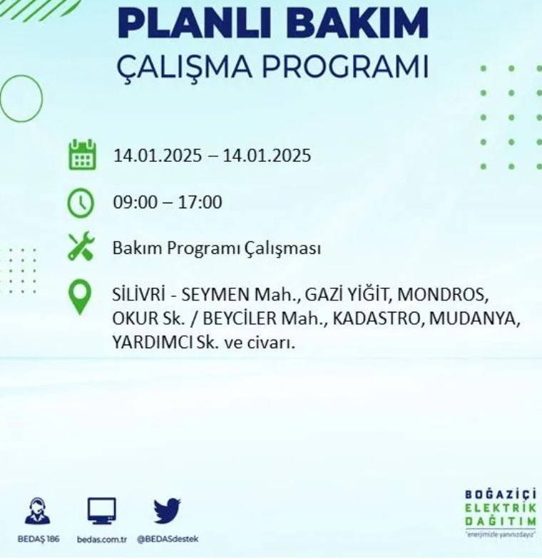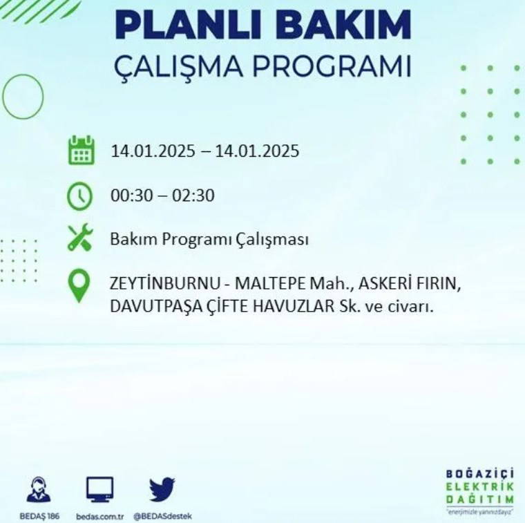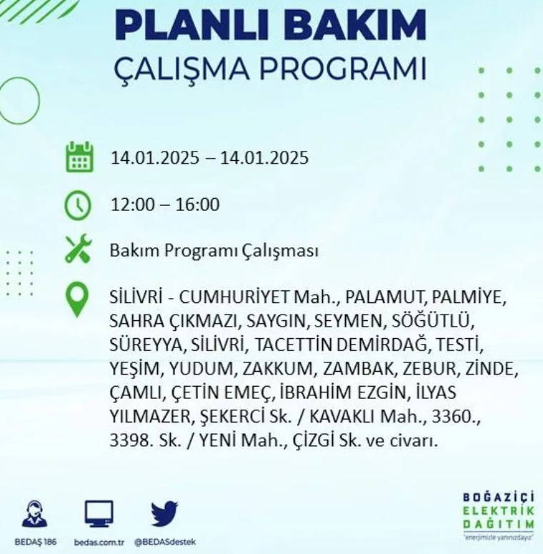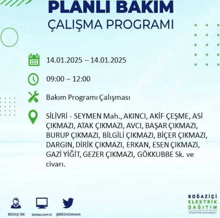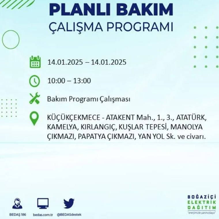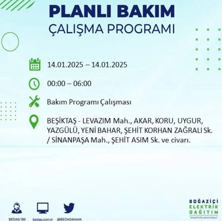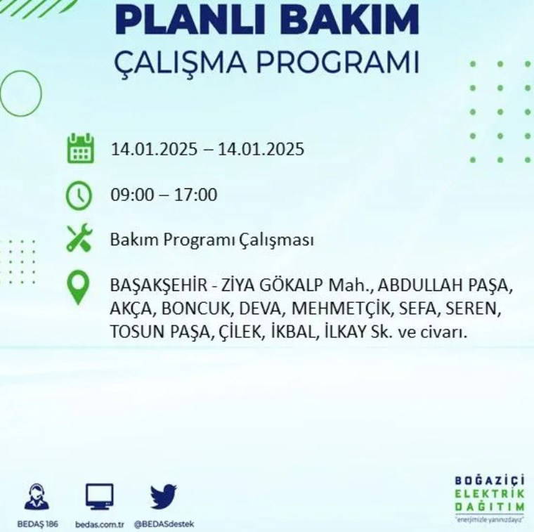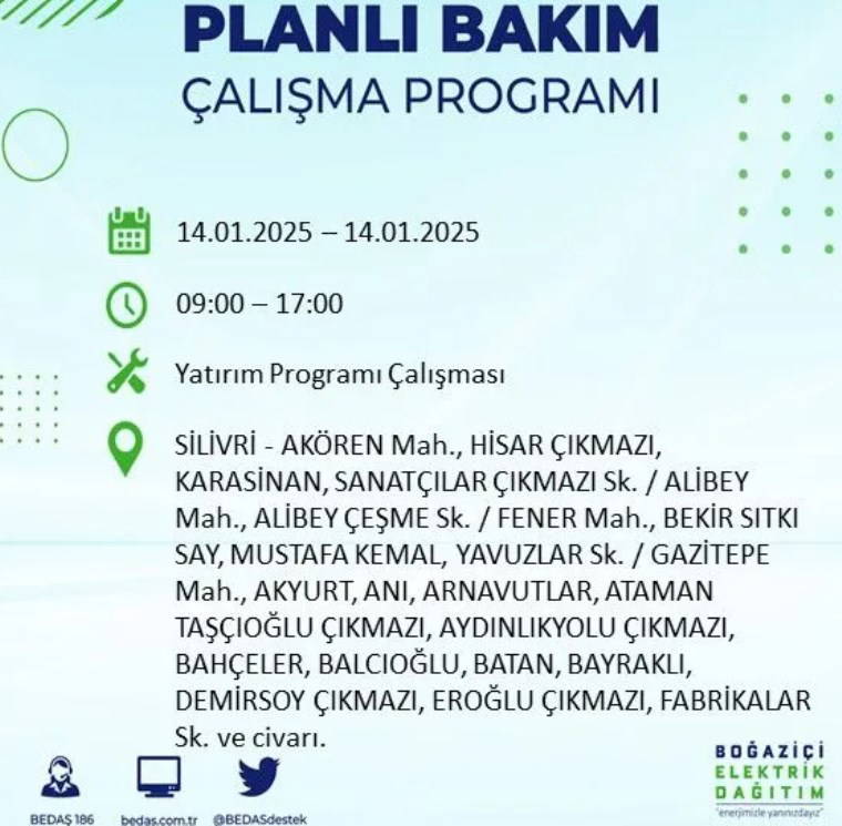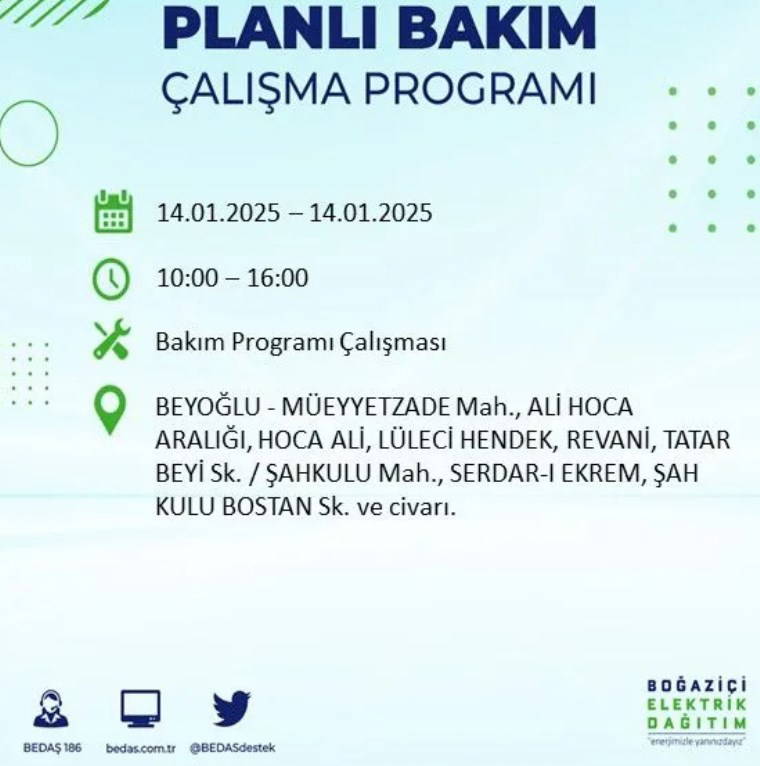 Boğaziçi Elektrik Dağıtım A.Ş. (BEDAŞ), İstanbul'da planlı bakım çalışmaları kapsamında 14 Ocak Salı günü (bugün) elektrik kesintilerinin yapılacağı ilçe, mahalle ve sokakları internet sitesi üzerinden duyurdu.