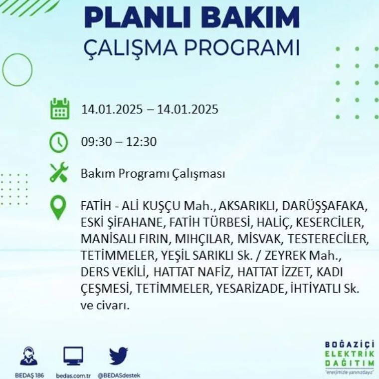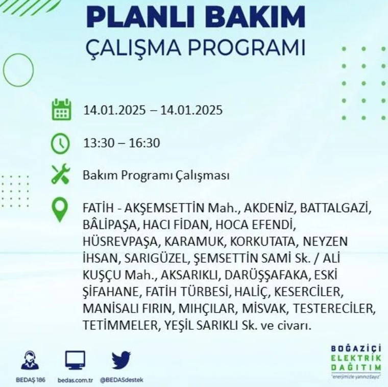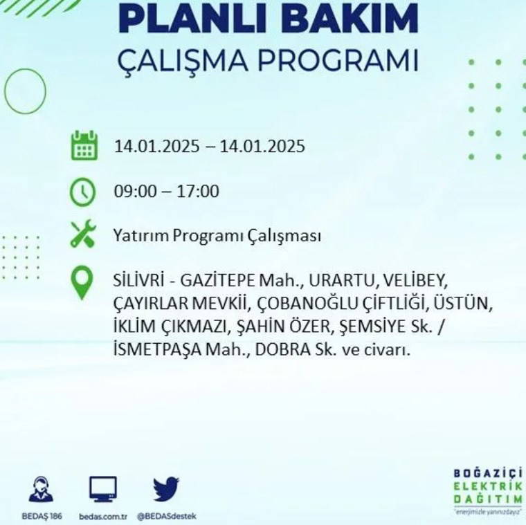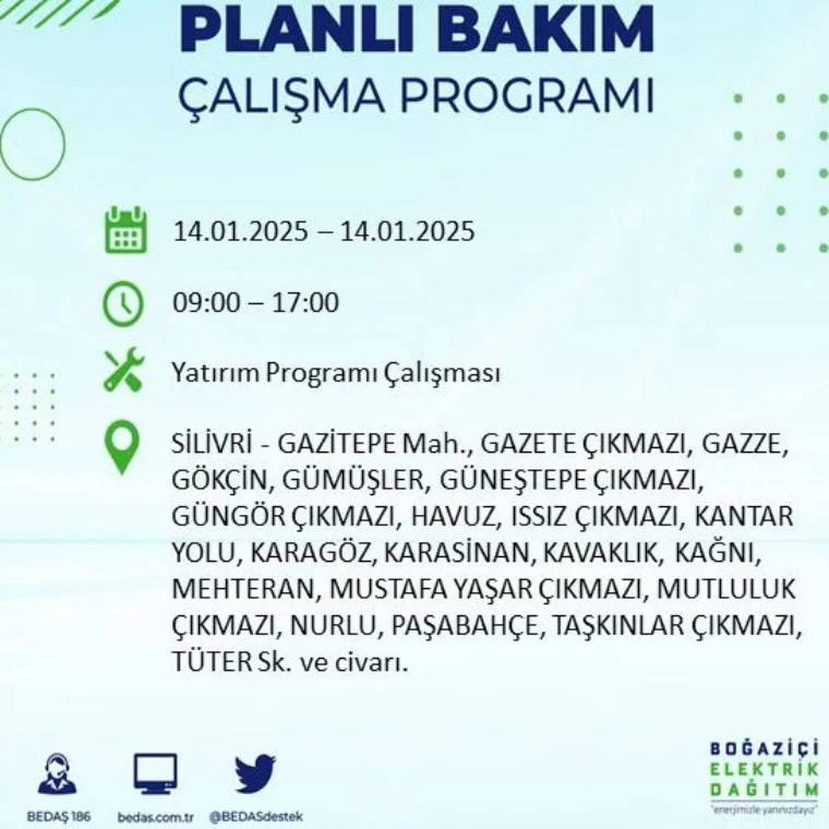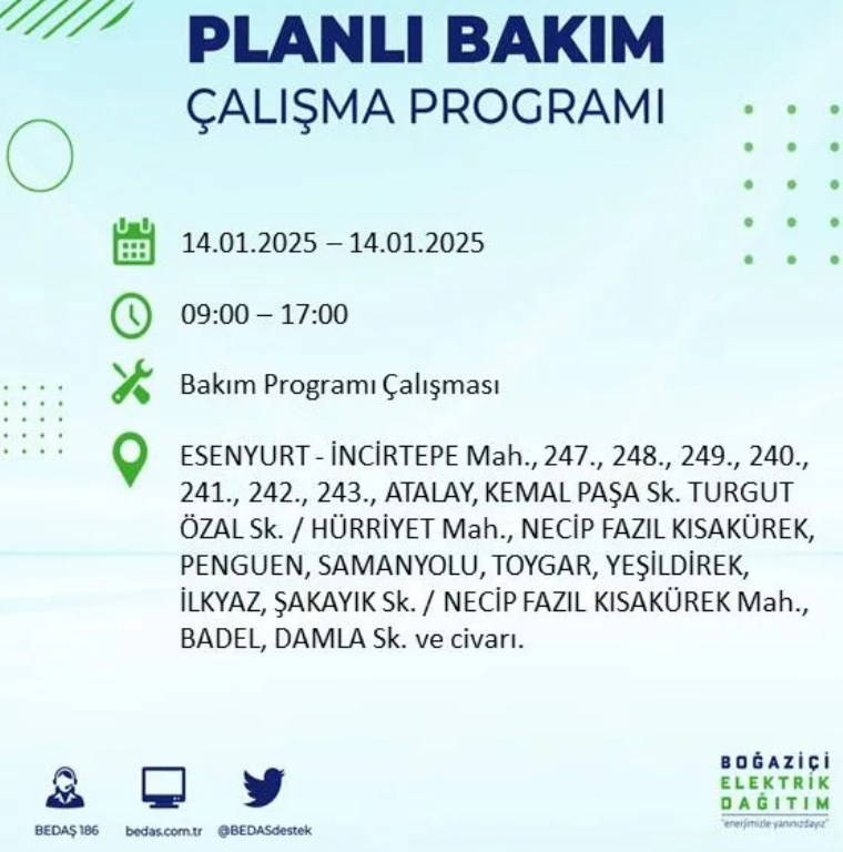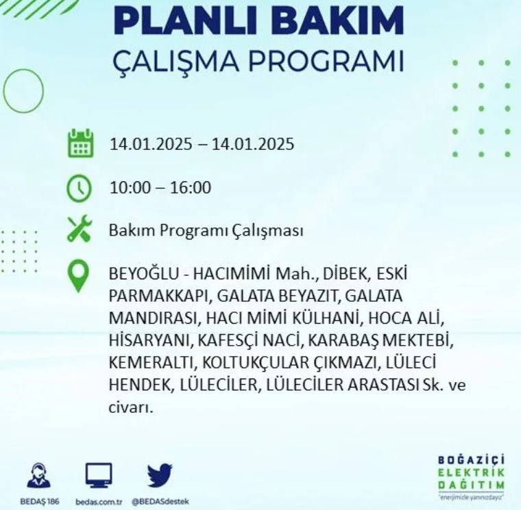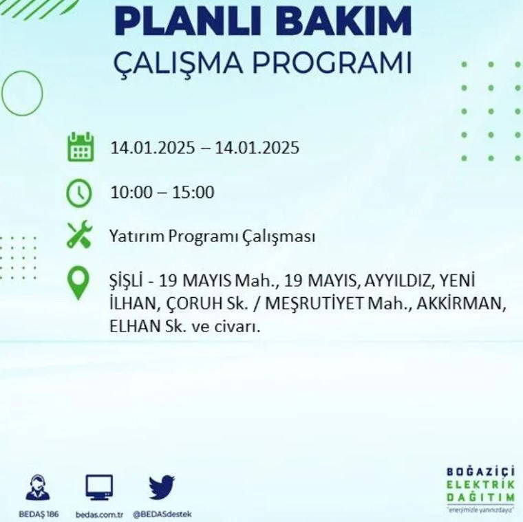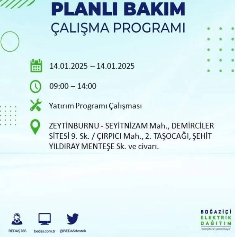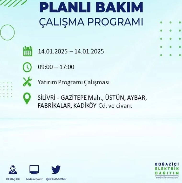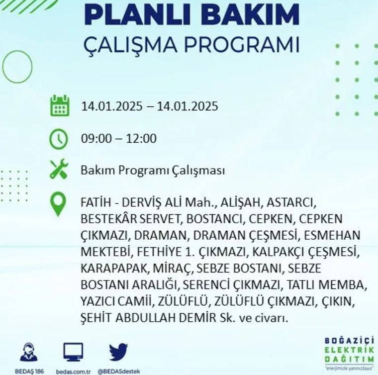 Boğaziçi Elektrik Dağıtım A.Ş. (BEDAŞ), İstanbul'da planlı bakım çalışmaları kapsamında 14 Ocak Salı günü (bugün) elektrik kesintilerinin yapılacağı ilçe, mahalle ve sokakları internet sitesi üzerinden duyurdu.