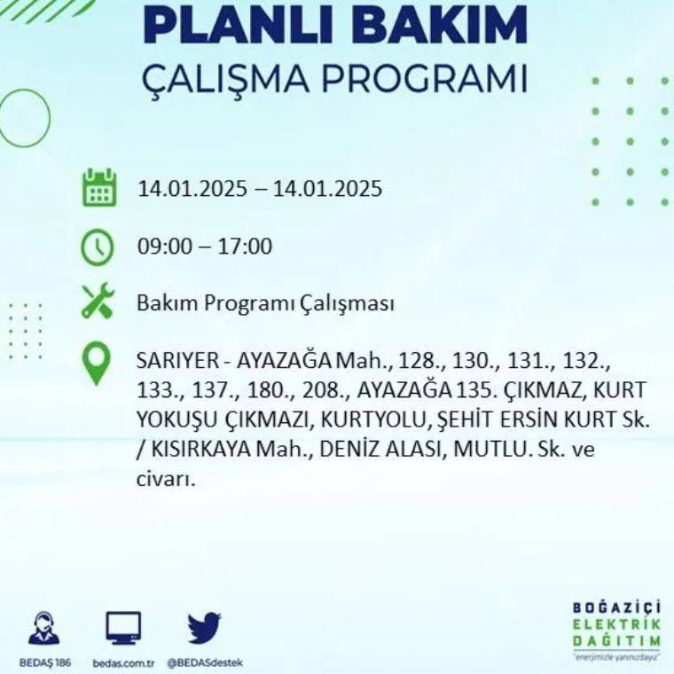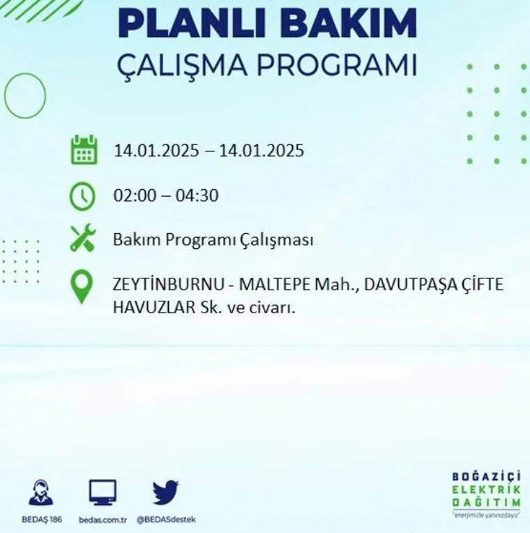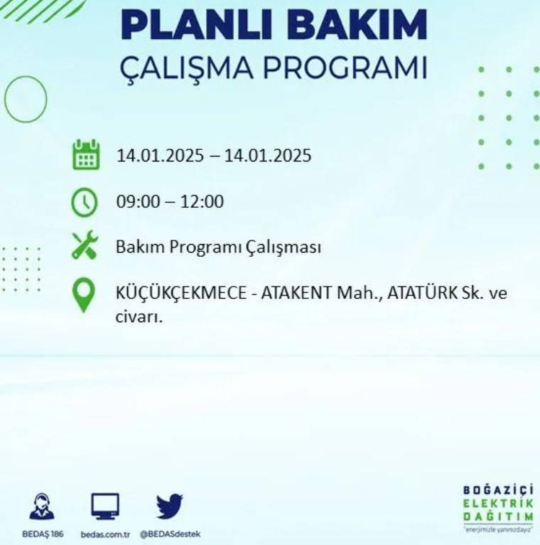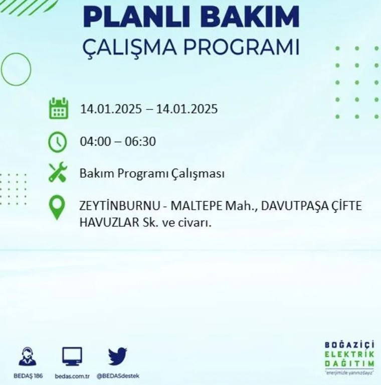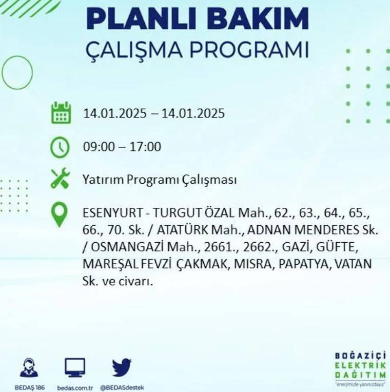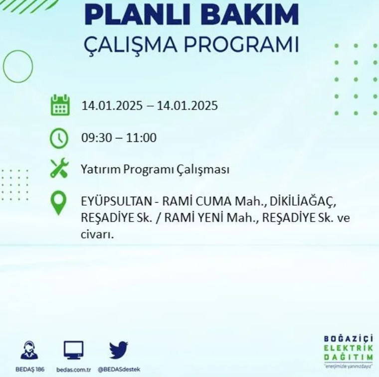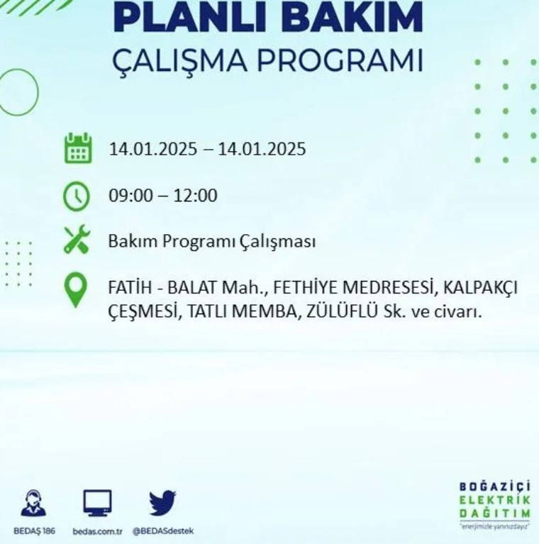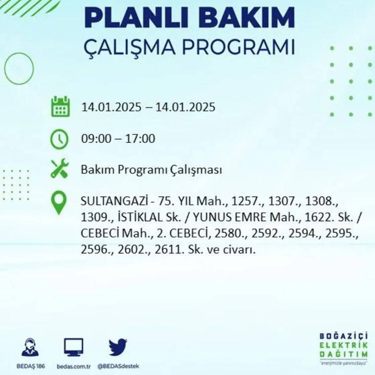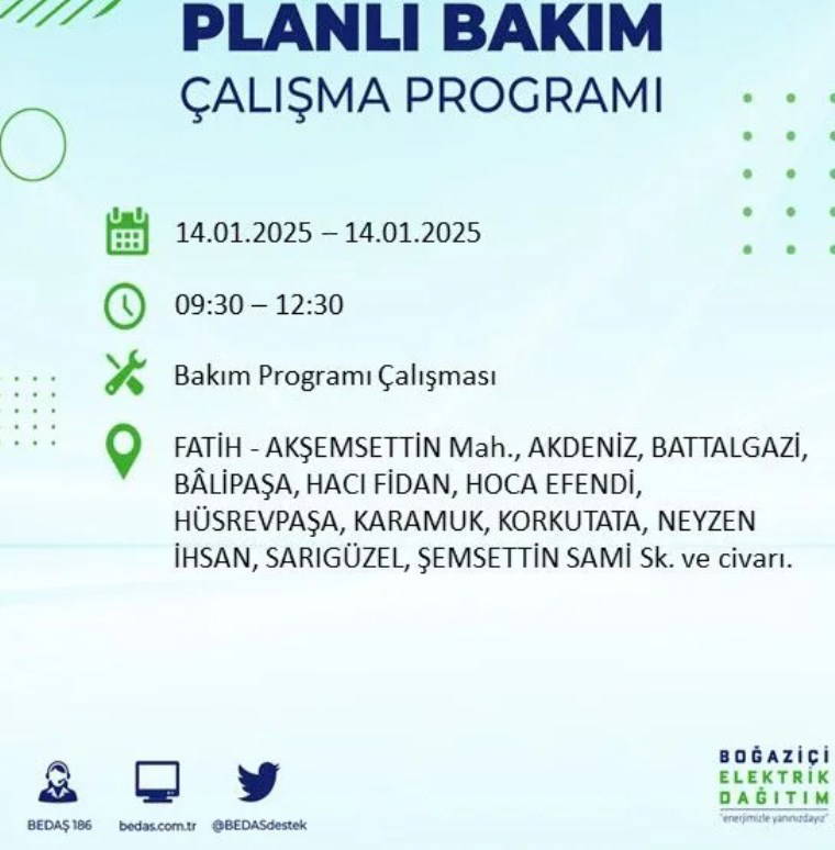 Boğaziçi Elektrik Dağıtım A.Ş. (BEDAŞ), İstanbul'da planlı bakım çalışmaları kapsamında 14 Ocak Salı günü (bugün) elektrik kesintilerinin yapılacağı ilçe, mahalle ve sokakları internet sitesi üzerinden duyurdu.