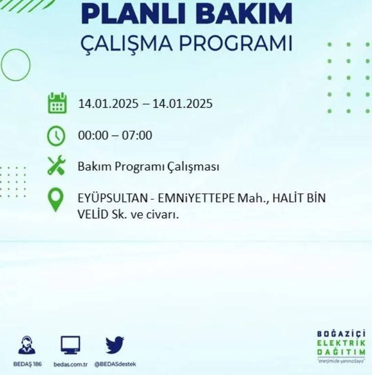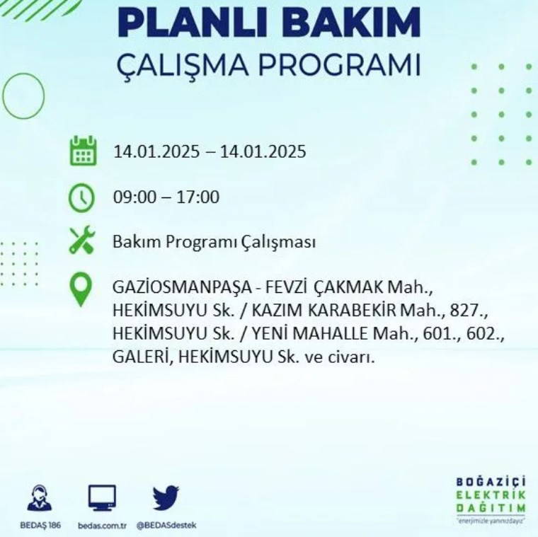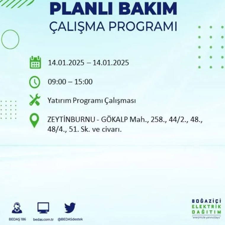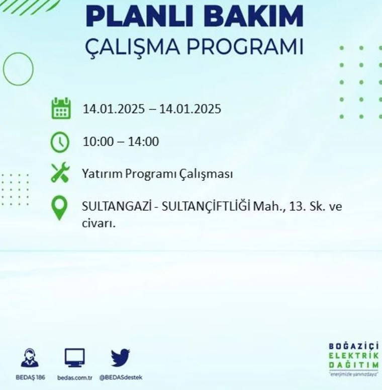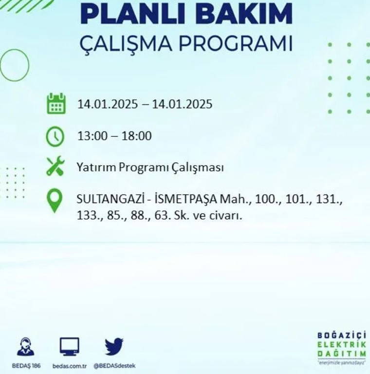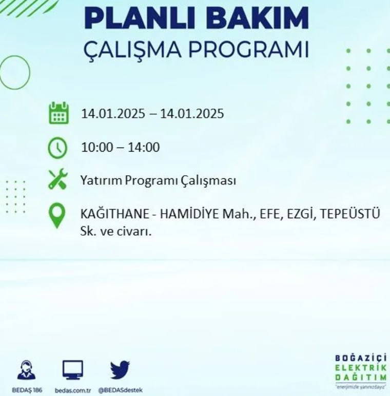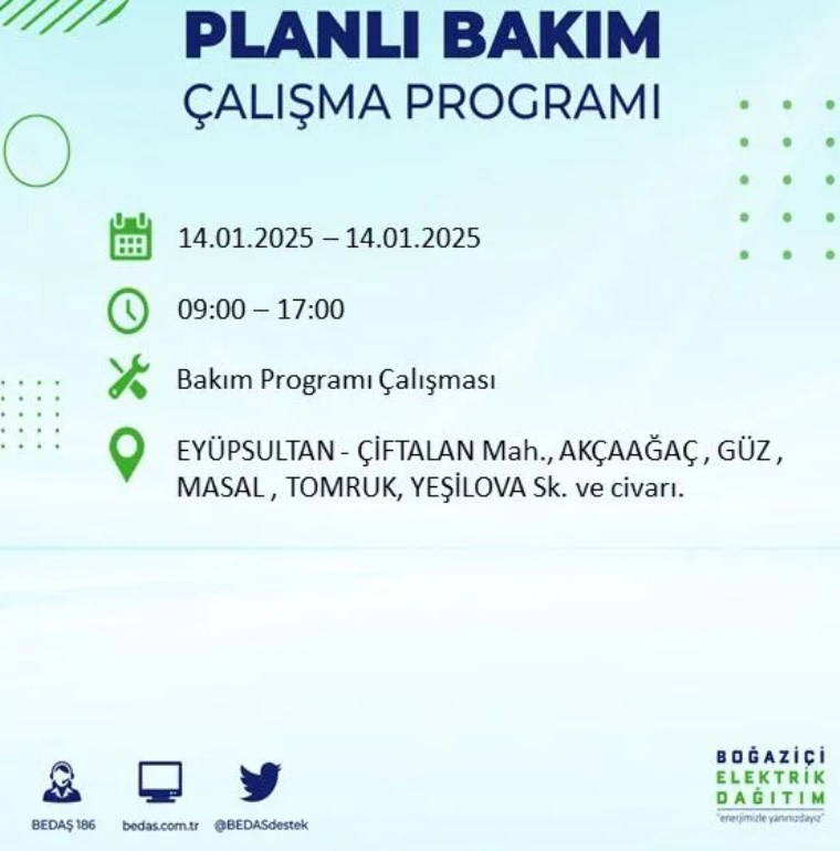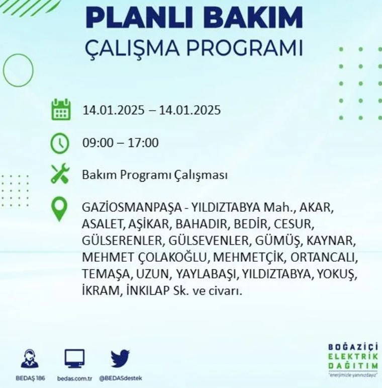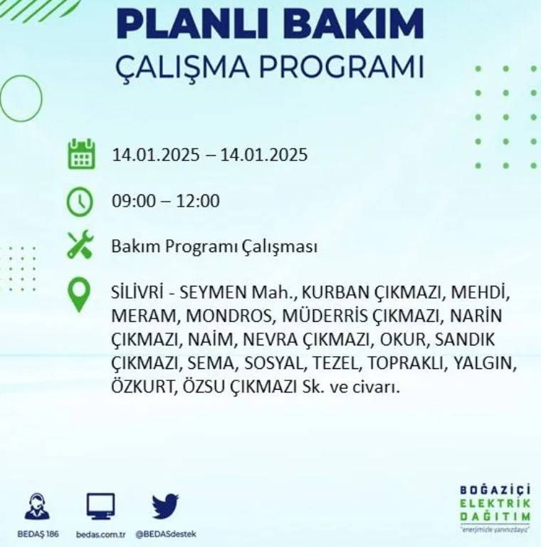 Boğaziçi Elektrik Dağıtım A.Ş. (BEDAŞ), İstanbul'da planlı bakım çalışmaları kapsamında 14 Ocak Salı günü (bugün) elektrik kesintilerinin yapılacağı ilçe, mahalle ve sokakları internet sitesi üzerinden duyurdu.