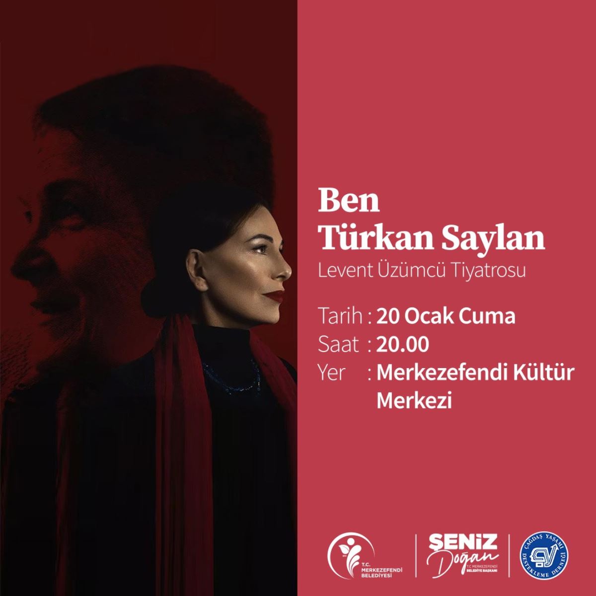Merkezefendi Belediyesi ve Çağdaş Yaşamı Destekleme Derneği iş birliği ile çağdaş Cumhuriyet kadını Türkan Saylan’ın yaşamının ele alındığı ‘Ben Türkan Saylan’ adlı oyun Denizlili tiyatroseverlerle buluşacak. 20 Ocak Cuma günü saat 20.00’de Merkezefendi Kültür Merkezi’nde tek perde olarak sahnelenecek.