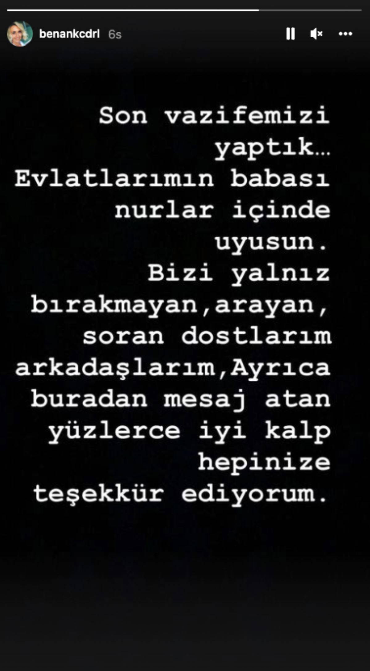 İki çocuğunun babasına son vazifesini yaptığını söyleyen Benan Kocadereli, "Evlatlarımın babası nurlar içinde uyusun. Bizi yalnız bırakmayan, arayan, soran dostlarım, arkadaşlarım ve ayrıca buradan mesaj atan yüzlerce iyi kalpli hepinize teşekkür ediyorum" dedi.