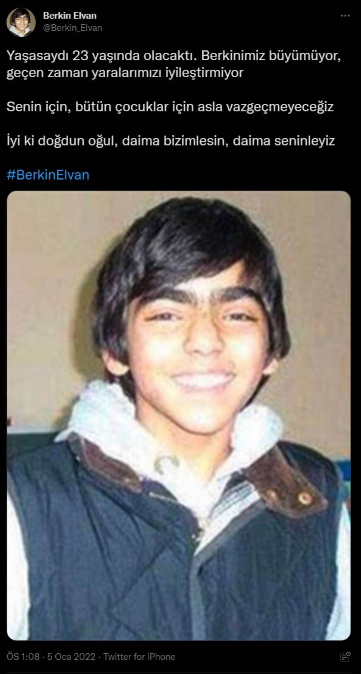 Berkin Elvan’ın ailesi sosyal medya hesabından “Yaşasaydı 23 yaşında olacaktı. Berkin'imiz büyümüyor, geçen zaman yaralarımızı iyileştirmiyor. Senin için, bütün çocuklar için asla vazgeçmeyeceğiz. İyi ki doğdun oğul, daima bizimlesin, daima seninleyiz #BerkinElvan” açıklamasını yaptı.