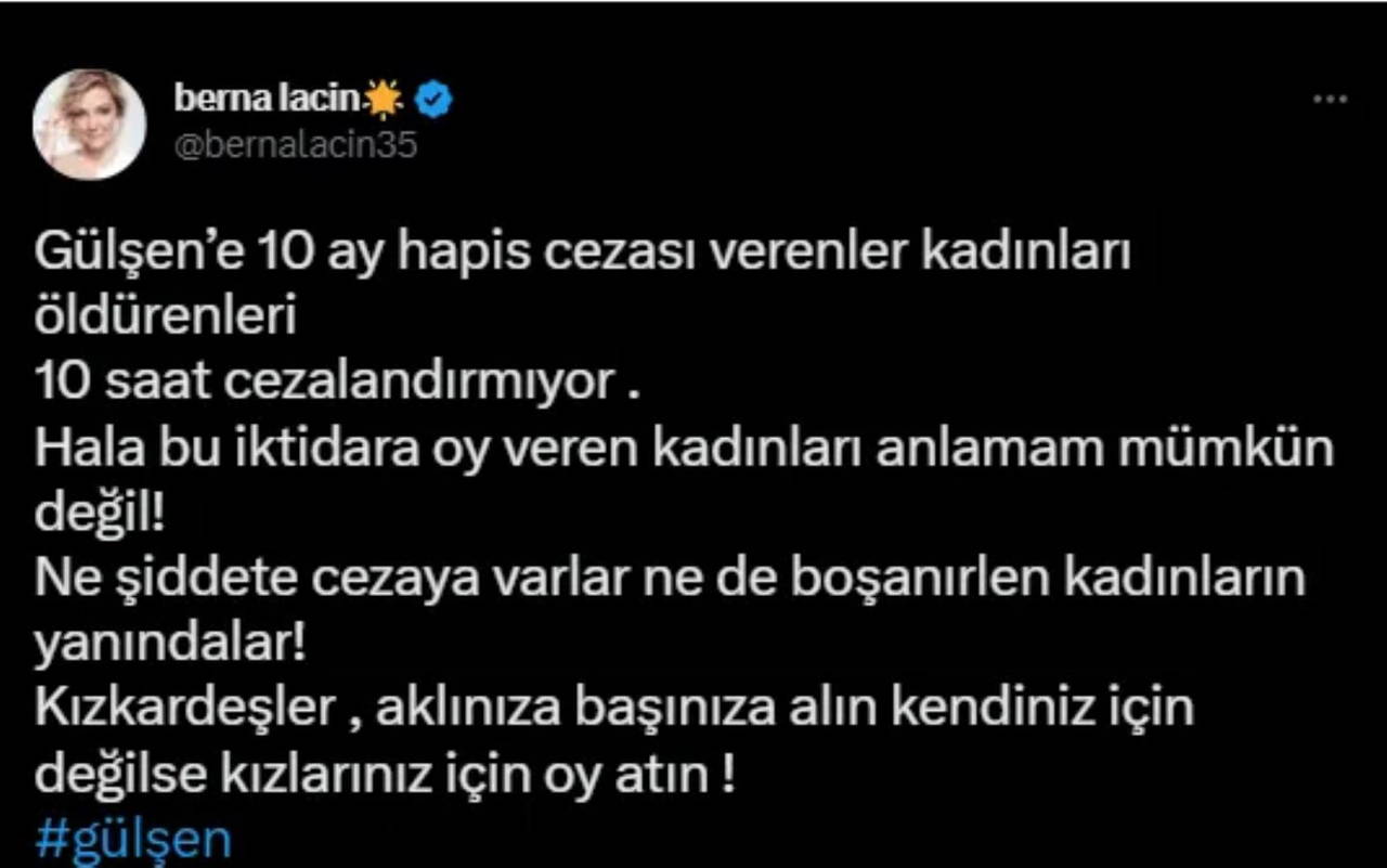Gülşen'e verilen hapis cezası sosyal medyada gündem oldu. Gülşen'e verilen cezaya tepki gösteren isimlerden biri olan Berna Laçin, seçime günler kala kadınlara çağrıda bulundu.