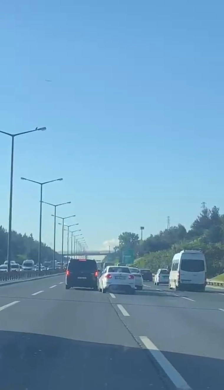 TEM Otoyolu Kavacık mevkii Ankara istikametinde, dün öğle saatlerinde hafif ticari araçla otomobil sürücüsü arasında yol verme nedeniyle tartışma çıktı.Sol şeritte ilerleyen hafif ticari araç sürücüsü hız keserek trafiği yavaşlattı.