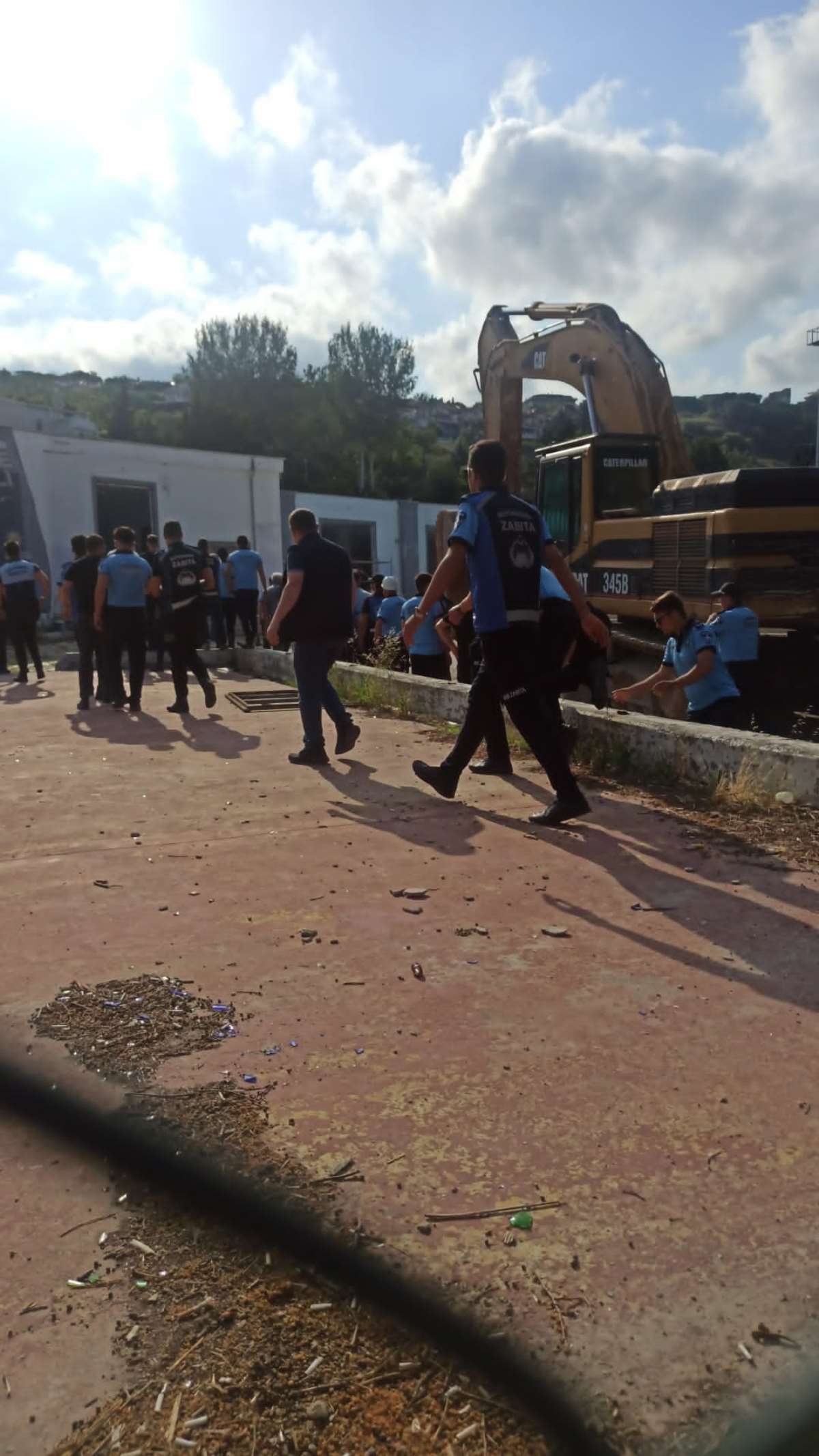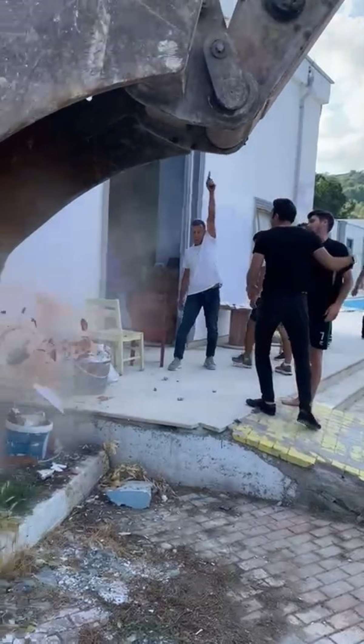 İş makinelerinin önüne sanayi tipi tüpler koyan grup, kepçelerin üstüne de çıktı. İş makinelerinin harekete geçmesi üzerine gruptakiler bıçak ve silah çekti. Bir kişi silahı zabıta ekiplerine defalarca doğrultup ateş etmekle tehdit etti. Ekiplerin ilerlemesi üzerine silahlı kişi havaya ateş açtı.