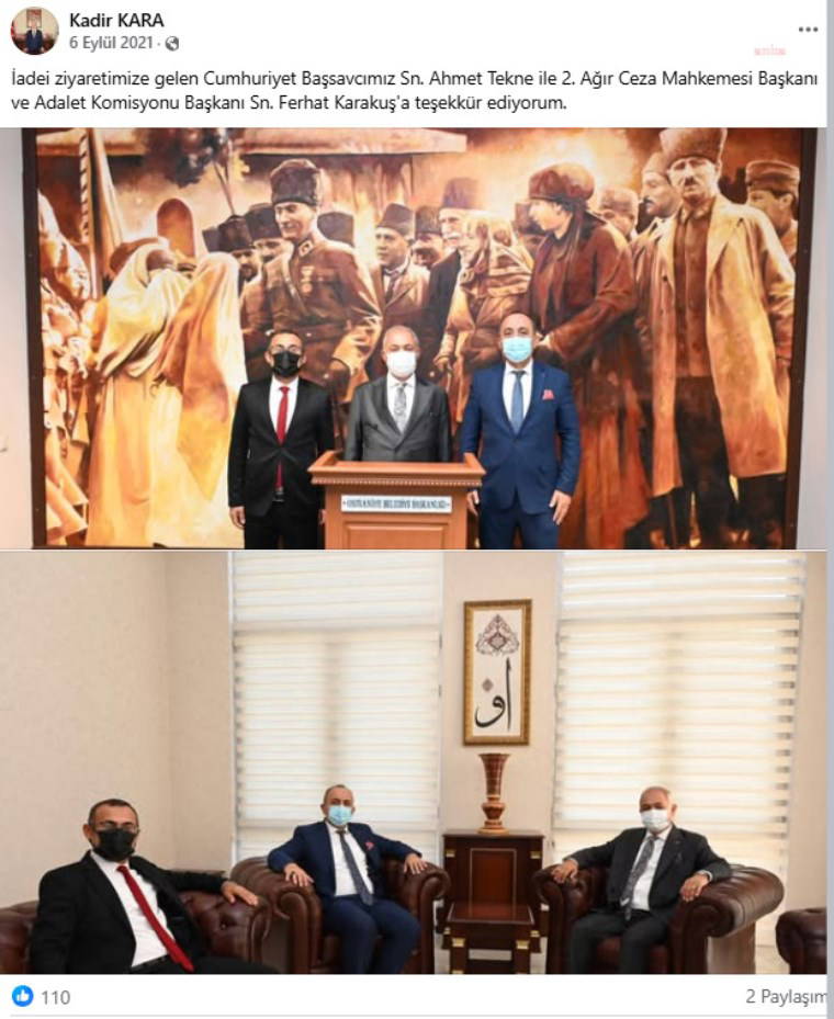 Eski MHP'li Osmaniye Belediye Başkanı Kadir Kara'nın 6 Eylül 2021 tarihinde sosyal medya hesabından yaptığı paylaşımda Osmaniye 2. Ağır Ceza Mahkemesi Başkanı Ferhat Karakuş ile fotoğrafı yer alıyor. Kara, paylaşımında, "İadeiziyaretimize gelen Cumhuriyet Başsavcımız Sn. Ahmet Tekne ile 2. Ağır Ceza Mahkemesi Başkanı ve Adalet Komisyonu Başkanı Sn. Ferhat Karakuş'a teşekkür ediyorum" ifadelerine yer vermişti.