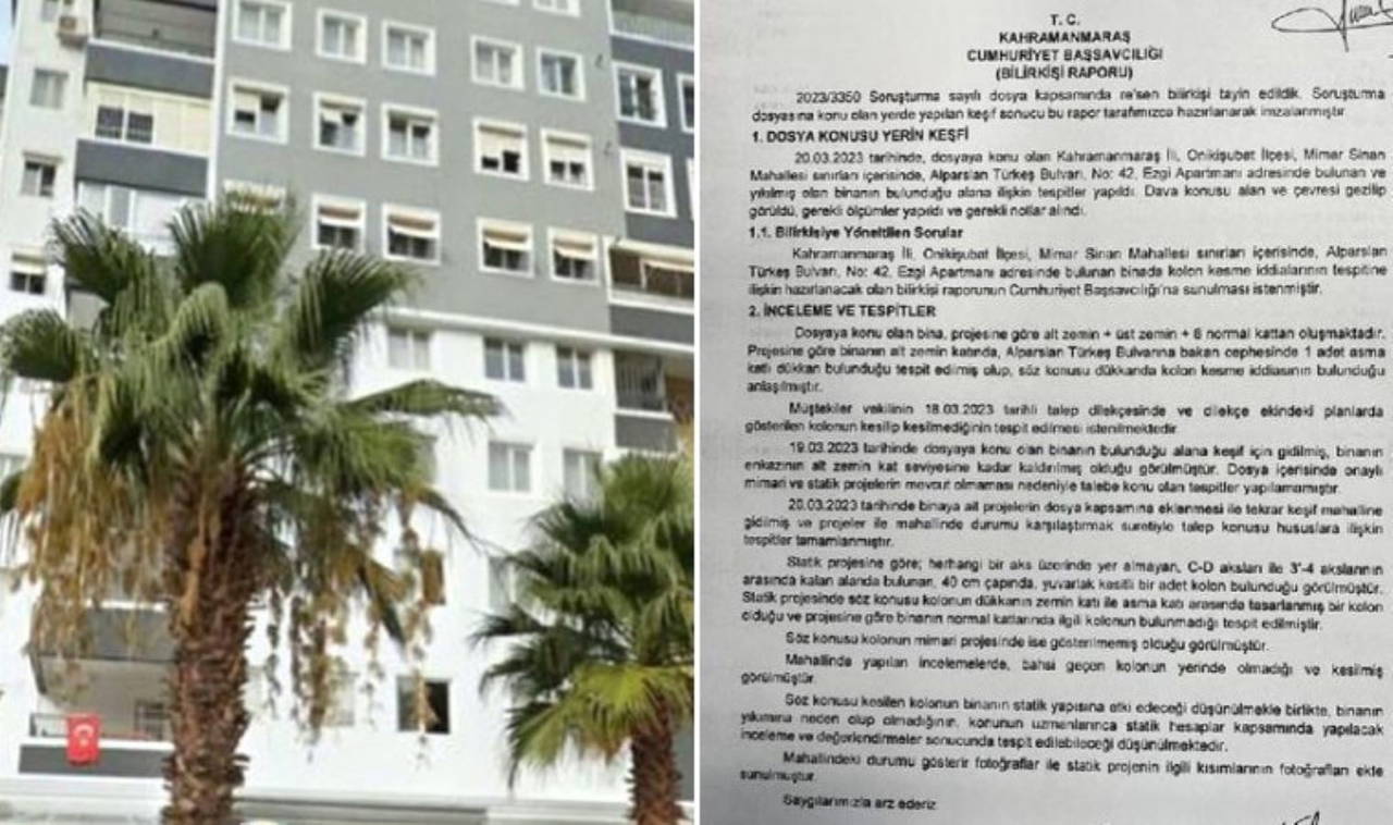 Kahramanmaraş Cumhuriyet Başsavcılığı'nca başlatılan soruşturma kapsamında Mimar İbrahim Yiğiter, İnşaat Mühendisi Erdi Kavaklı ve İnşaat Mühendisi Mehmet Celalettin Somuncuoğlu bilirkişi olarak tayin edildi. Detaylı inceleme yapan bilirkişi, zemin katta kolon kesildiğini tespit edip hazırladığı raporu Kahramanmaraş Cumhuriyet Başsavcılığı'na sundu.