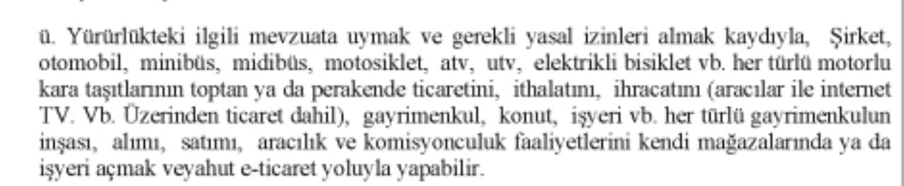 - Yürürlükteki ilgili mevzuata uymak ve gerekli yasal izinleri almak kaydıyla, şirket, otomobil, minibüs, midibüs, motosiklet, atv, utv, elektrikli bisiklet vb. her türlü motorlu kara taşıtlarının toptan ya da perakende ticaretini, ithalatını, ihracatını (aracılar ile internet TV. Vb. üzerinden ticaret dahil) gayrimenkul, konut, işyeri vb. her türlü gayrimenkulün inşası, alımı, satımı, aracılık ve komisyonculuk faaliyetlerini kendi mağazalarında ya da işyeri açmak veyahut e-ticaret yoluyla yapabilir.