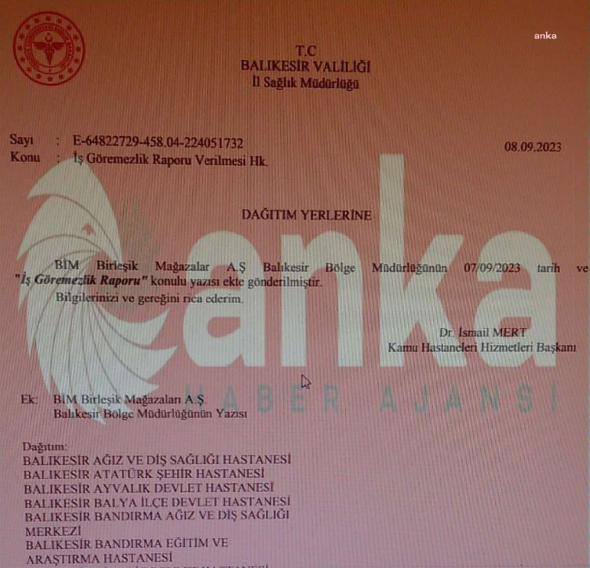 Kamu Hastaneleri Hizmetleri Başkanı Dr. İsmail Mert imzalı, ‘İş göremezlik raporu verilmesi hakkında’ konulu 8 Eylül 2023 tarihli yazıda, BİM Birleşik Mağazalar A.Ş. Balıkesir Bölge Müdürlüğü’nün 7 Eylül 2023 tarih ve ‘İş görmezlik raporu’ konulu yazısı ekte gönderilmiştir. Bilgilerinizi ve gereğini rica ederim” denildi.