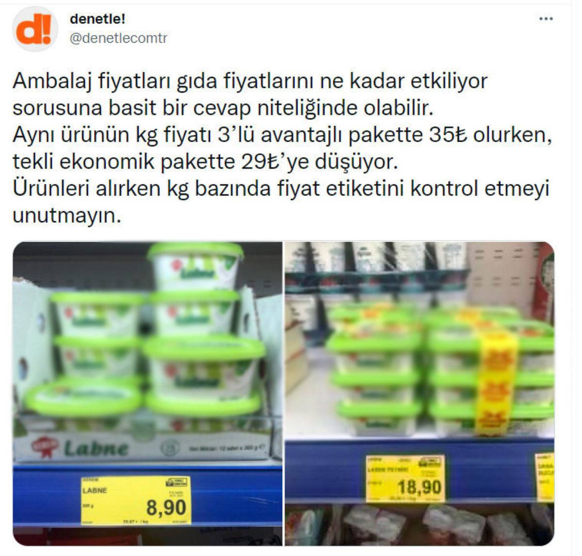 Denetle, “Ambalaj fiyatları gıda fiyatlarını ne kadar etkiliyor sorusuna basit bir cevap niteliğinde olabilir. Aynı ürünün kg fiyatı 3’lü avantajlı pakette 35? olurken, tekli ekonomik pakette 29?’ye düşüyor. Ürünleri alırken kg bazında fiyat etiketini kontrol etmeyi unutmayın” mesajını paylaştı.