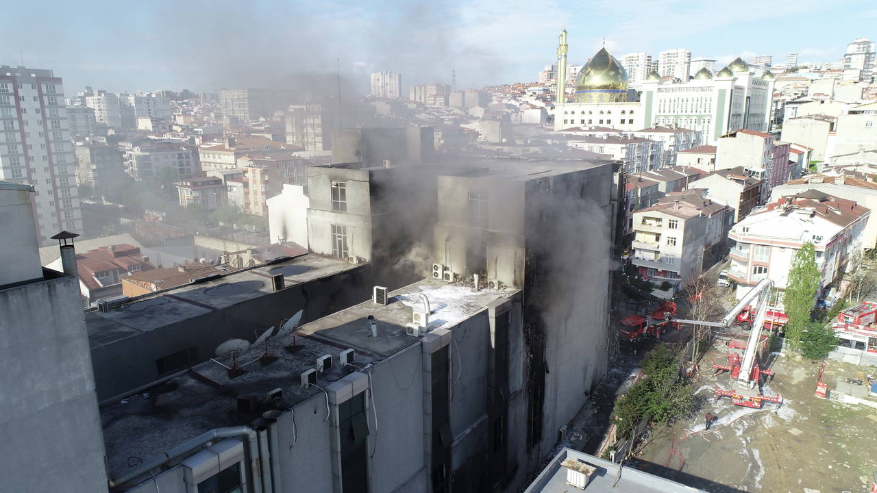 Yoğun dumanların yükseldiği görülen bina havadan da görüntülendi.