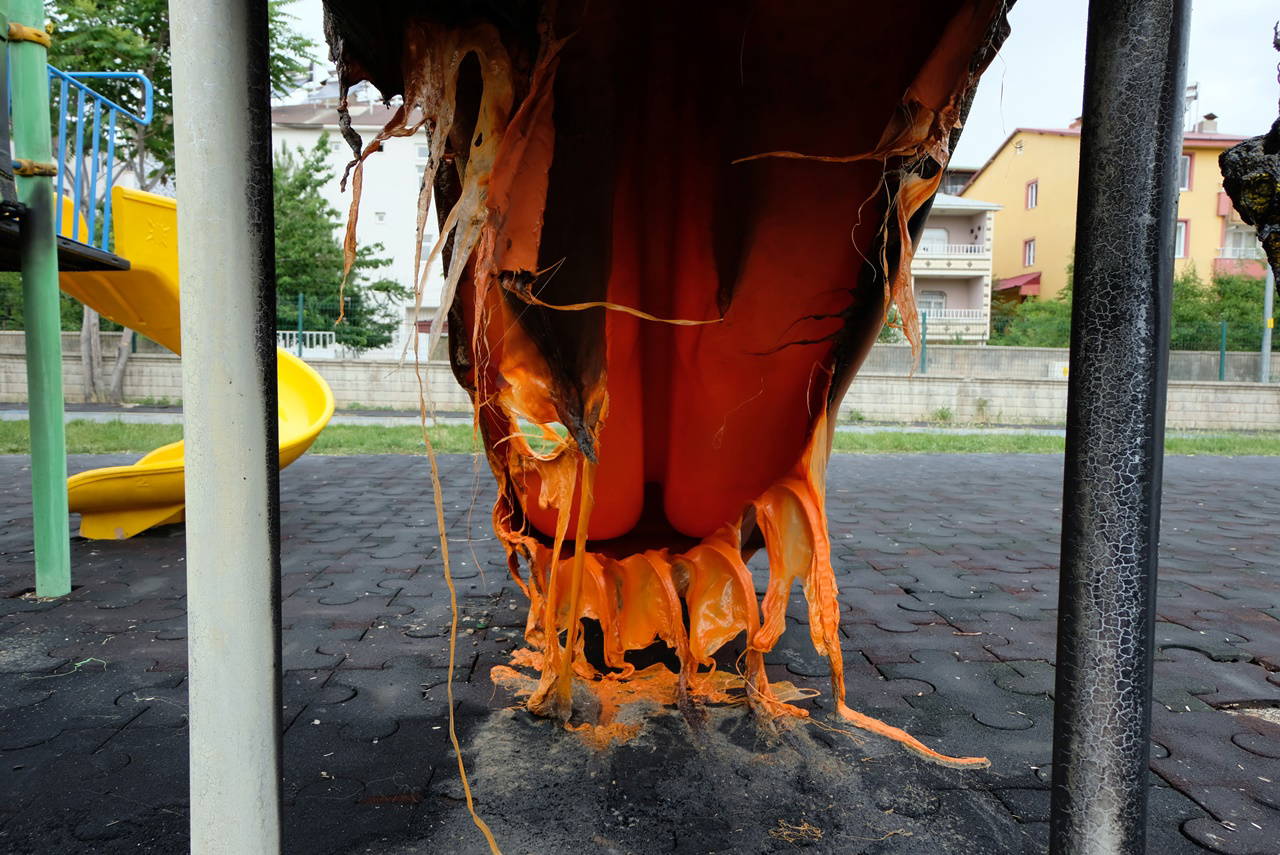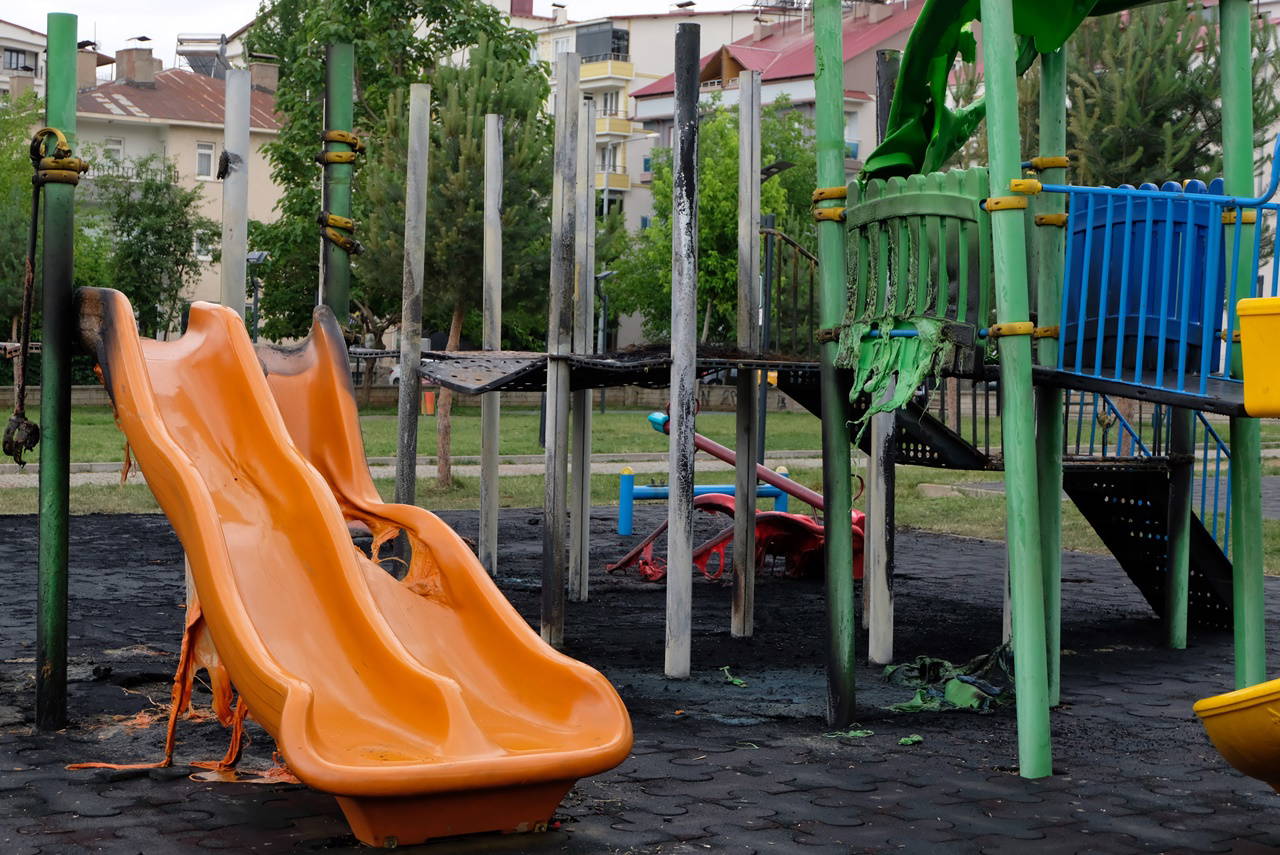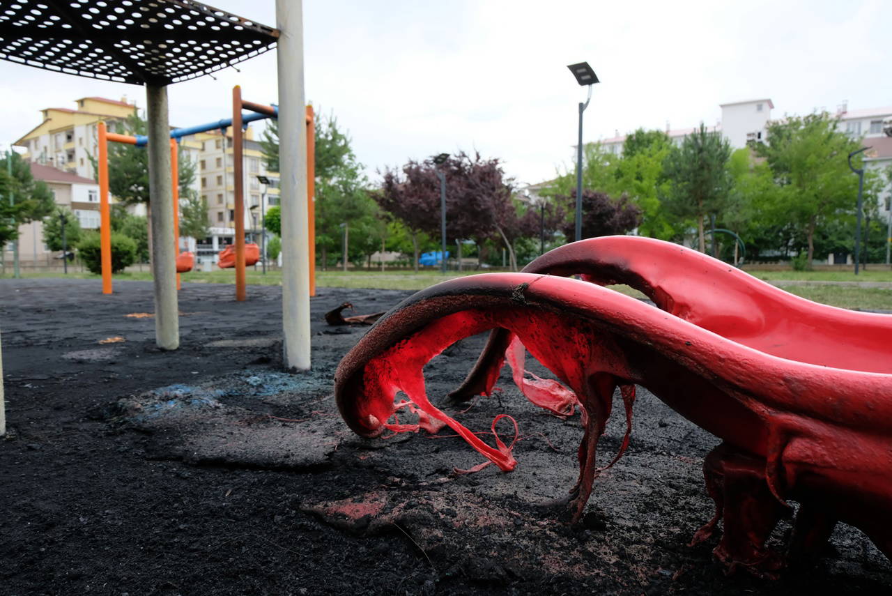 Yangın, itfaiye ekiplerinin müdahalesiyle söndürüldü. Çocuk oyun grupları kullanılmaz hale geldi.