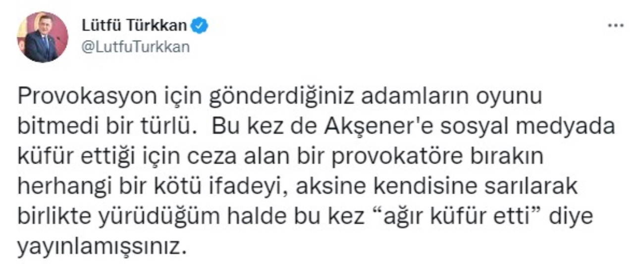 Konuyla ilgili Twitter hesabından açıklama yapan Türkkan, "Provokasyon için gönderdiğiniz adamların oyunu bitmedi bir türlü. Bu kez de Akşener'e sosyal medyada küfür ettiği için ceza alan bir provokatöre bırakın herhangi bir kötü ifadeyi, aksine kendisine sarılarak birlikte yürüdüğüm halde bu kez 'ağır küfür etti' diye yayınlamışsınız." ifadelerini kullandı.