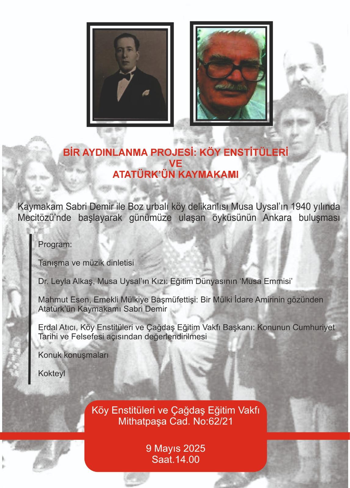 9 Mayıs 2025 tarihinde yapılan etkinlik büyük bir beğeniyle izlendi. Toplantı, Cumhuriyetin kuruluş döneminin ruhunu yansıtan bir müzik dinletisiyle başladı, arkasından Zarife Sakarya, Köy Enstitüleri ve Çağdaş Eğitim Vakfı adına gelen konukları selamladı. Mahmut Esen, “Bir Mülki İdare Amirinin Gözünden Atatürk’ün Kaymakamı Sabri Demir”i, Leyla Alkaş da, “Eğitim Dünyasının Musa Emmisini” anlattılar.