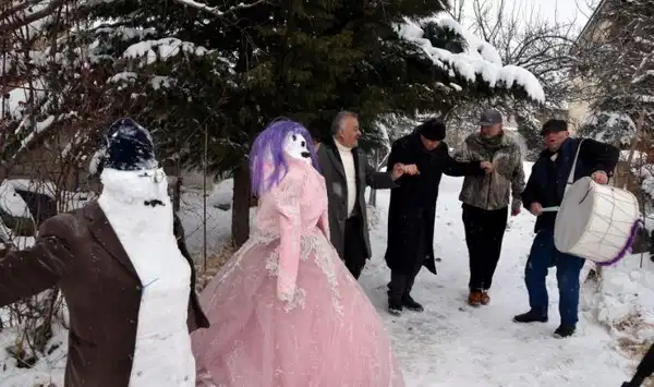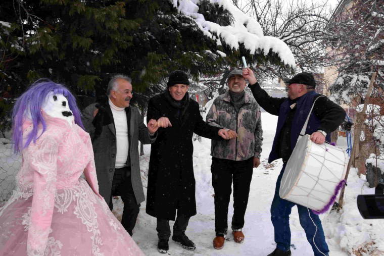 6 kişi, kardan gelin ve damat yaptıktan sonra müzik ve davul eşliğinde halay çekti. Faruk Poyrazoğlu, "Uzun zamandır ilçemize kar yağmıyordu. Dün başlayan yoğun kar yağışı, yüzümüzü güldürdü. Ekinlerimiz, yer altı kaynaklarının suya ihtiyacı var. Bu da kar yağışının olması ile mümkündür. Kurak geçen günlerin ardından güzel bir kar yağışı oldu. Biz de bunu kutlamak için arkadaşlarla kardan gelin ve damat yapıp, davul ve müzik eşliğinde oynadık" dedi.