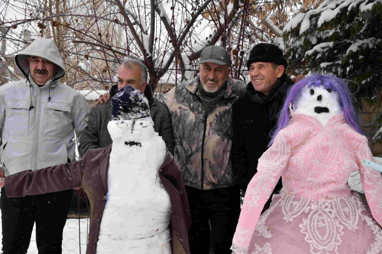 Van'ın Erciş ilçesinde 6 kişi, yoğun kar yağışını kutlamak için kardan gelin ve damat yapıp, müzik ve davul eşliğinde halay çekti.