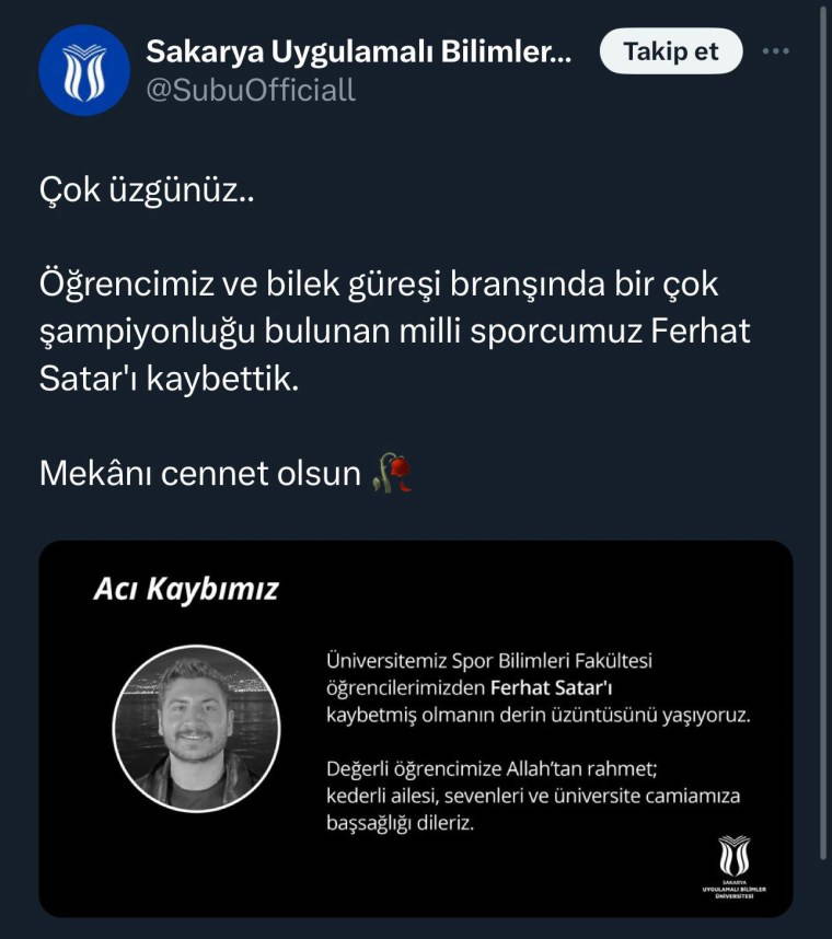 Öte yandan, Sakarya Uygulamalı Bilimler Üniversitesi (SUBÜ) tarafından da Ferhat Satar’ın ölümüne ilişkni başsağlığı mesajı yayınlamdı.