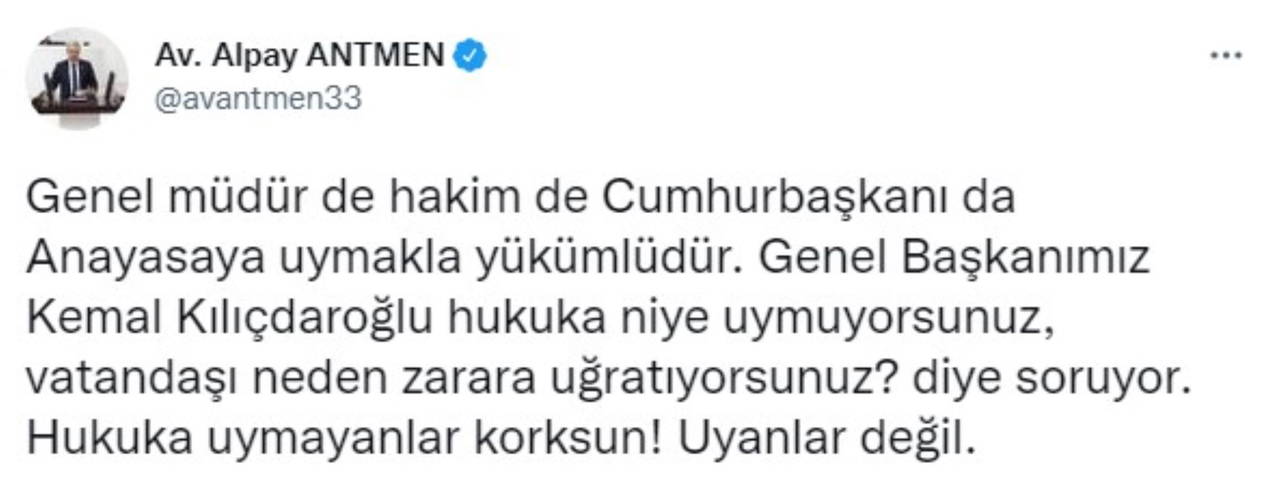 CHP Mersin Milletvekili Alpay Antmen, Erdoğan'ın söz konusu ifadelerine sosyal medya hesabı Twitter'dan tepki gösterdi. Antmen, "Genel müdür de hakim de Cumhurbaşkanı da Anayasaya uymakla yükümlüdür. Genel Başkanımız Kemal Kılıçdaroğlu hukuka niye uymuyorsunuz, vatandaşı neden zarara uğratıyorsunuz? diye soruyor. Hukuka uymayanlar korksun! Uyanlar değil" dedi.