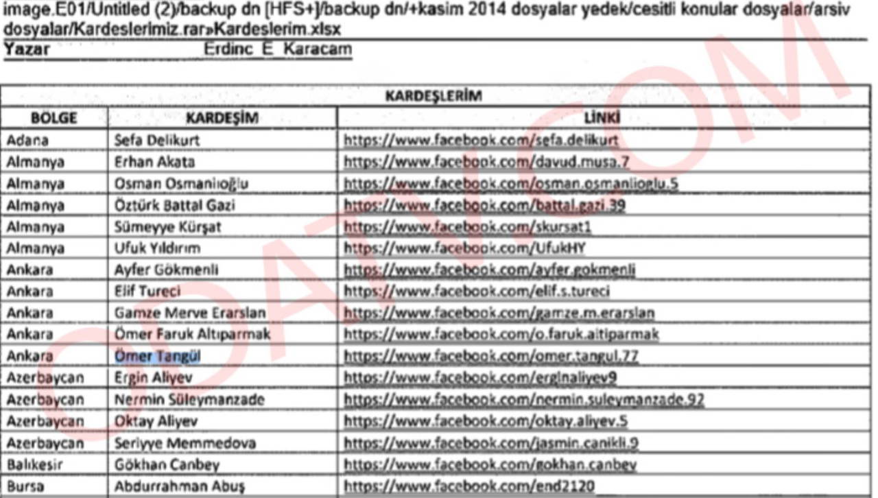 Ele geçirilen Oktarcı bir ismin hardiskinden alınan imaj raporları arasında, Excel tabloları içerisinde, soruşturmada isimleri geçen Oktarcı 146 farklı kişinin bölgesi, ismi ve Facebook hesabını gösteren bir liste tespit ediliyordu. Söz konusu liste, “kardeşlerim” ismini taşırken, bu liste içerisinde Ömer Tangül’ün de ismi yazılıyordu.
