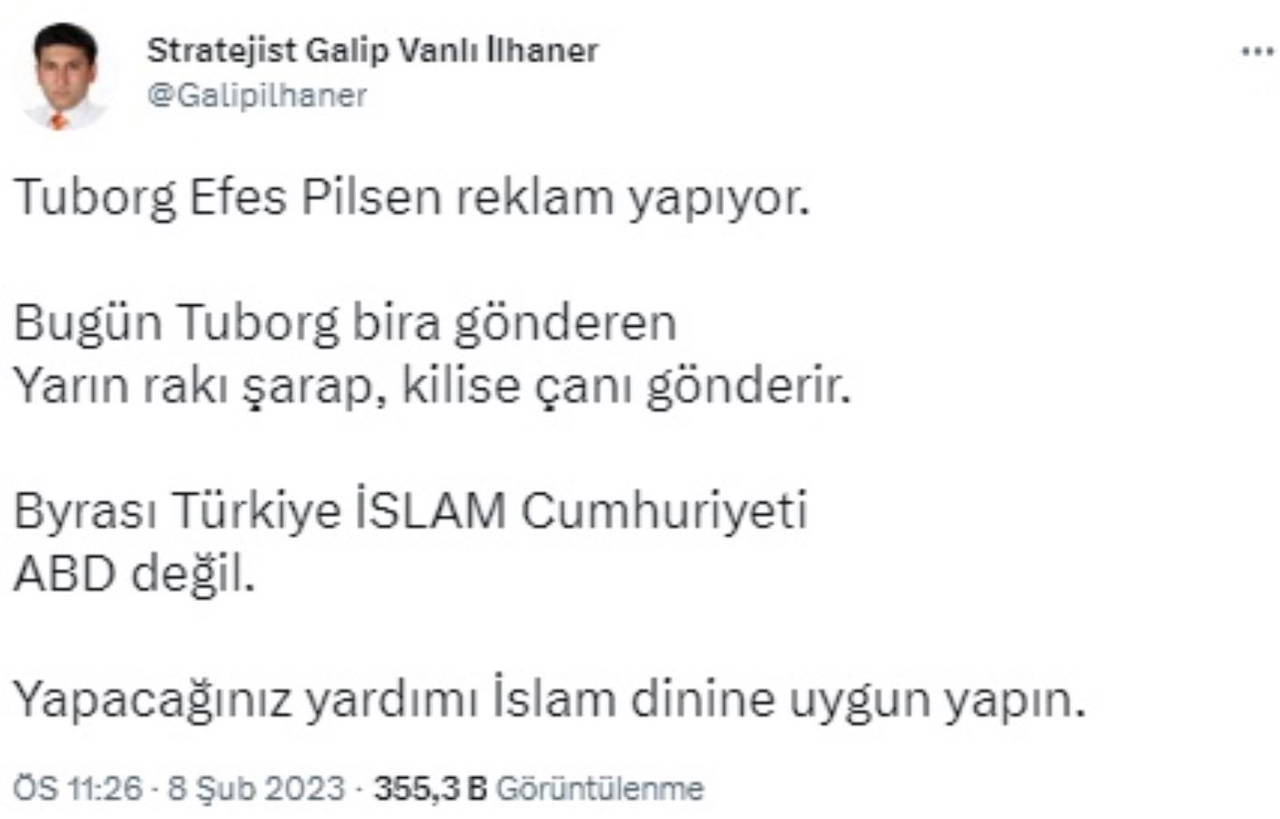 Gazetenin yazarlarından Galip İlhaner, Twitter üzerinden yaptığı paylaşımında, gönderilmek istendiği iddia edilen yardımın bira logolu giysiler değil de biranın kendisi olduğunu iddia edip "Bugün Tuborg bira gönderen yarın rakı şarap, kilise çanı gönderir" dedi.